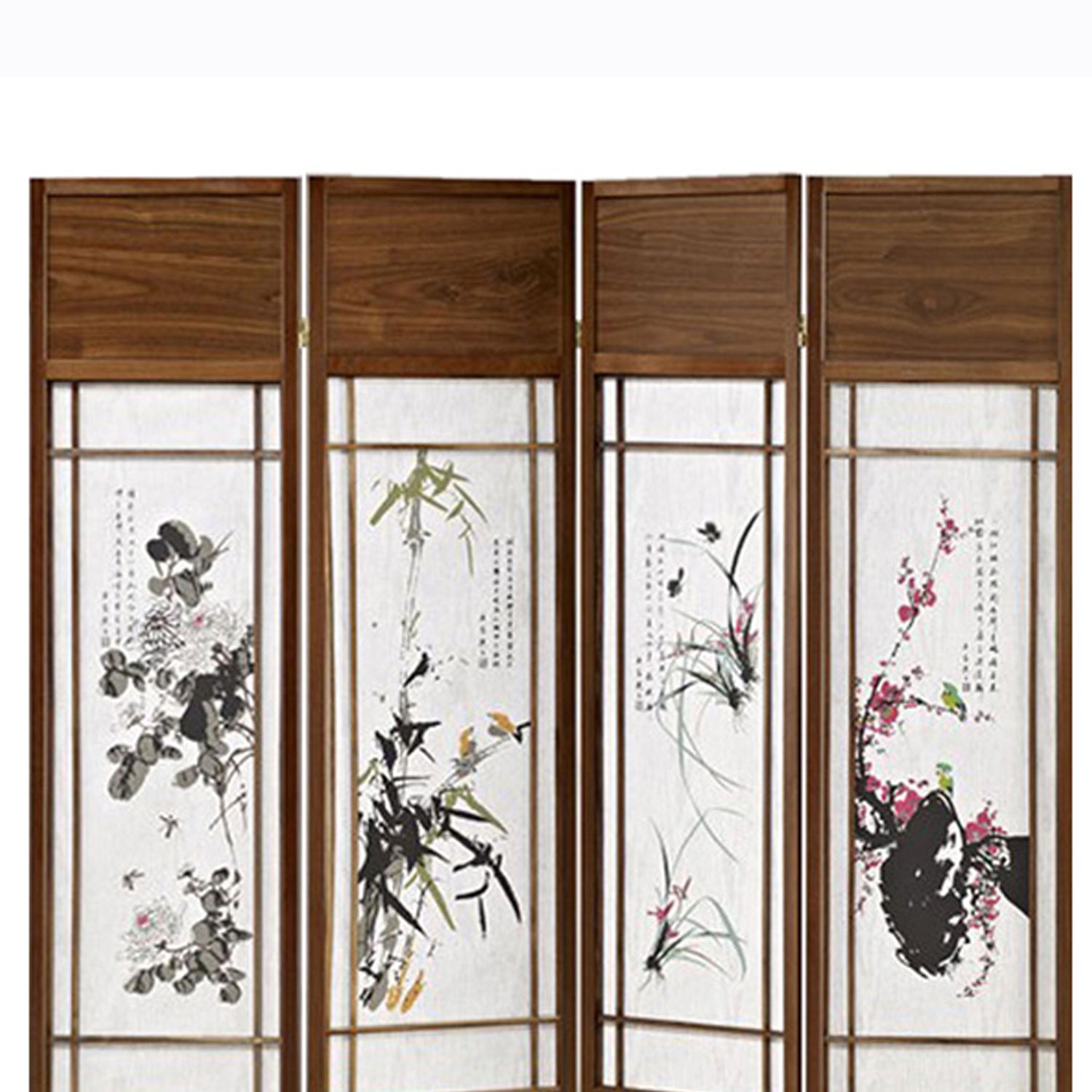 Need a break from your daily mundane chores, bring home this coveted transitional style 4 panel room divider. Provided with a foldable mechanism, this wooden room divider showcases Asian painting with shoji paper inserts. Incorporated with metal hinges, it will be a perfect addition to your existing decor.
