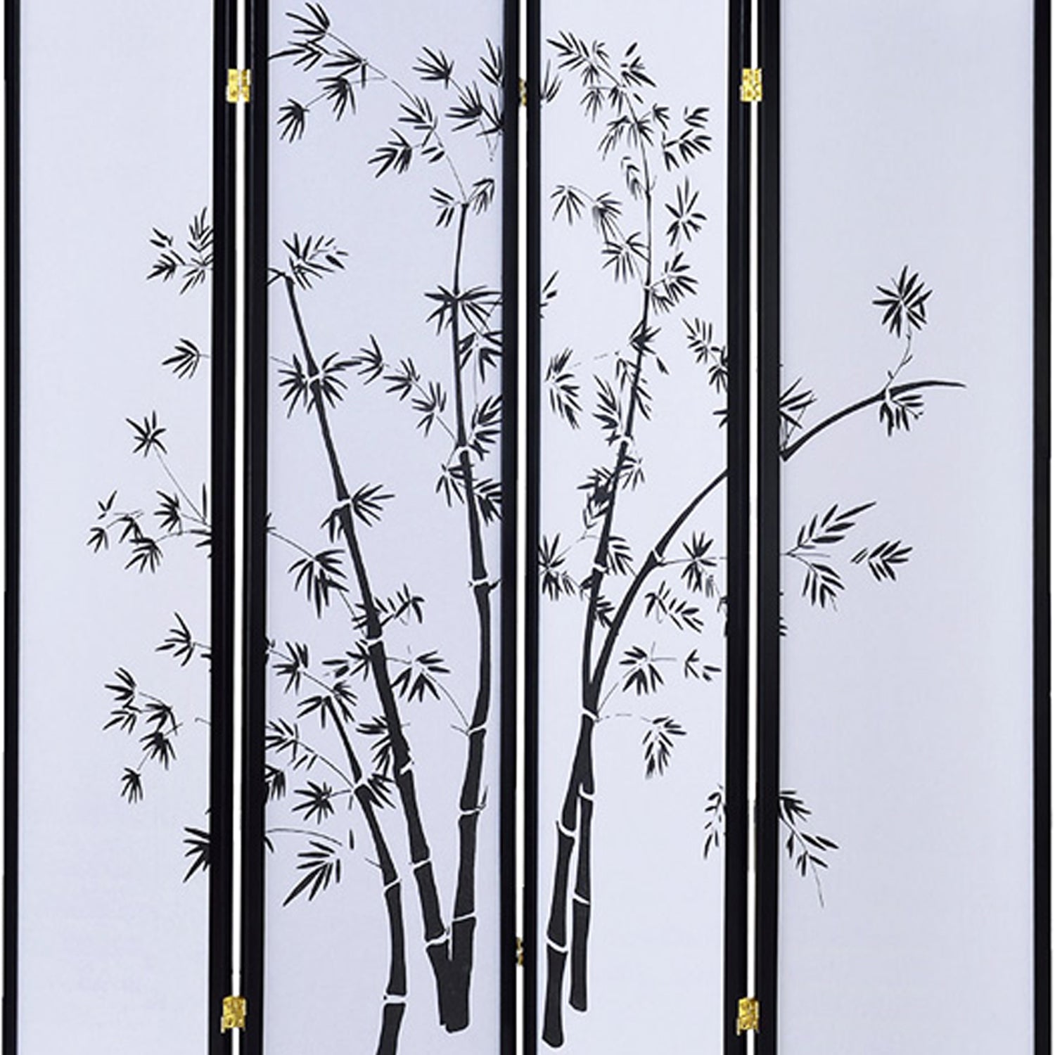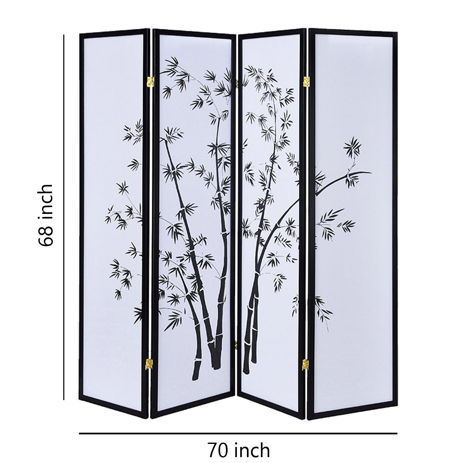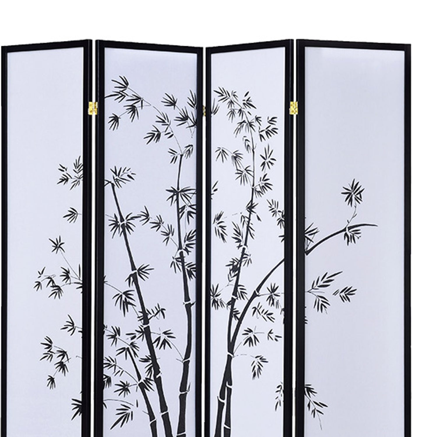 Bamboo Print 4 Panel Wooden Room Divider, Black and White