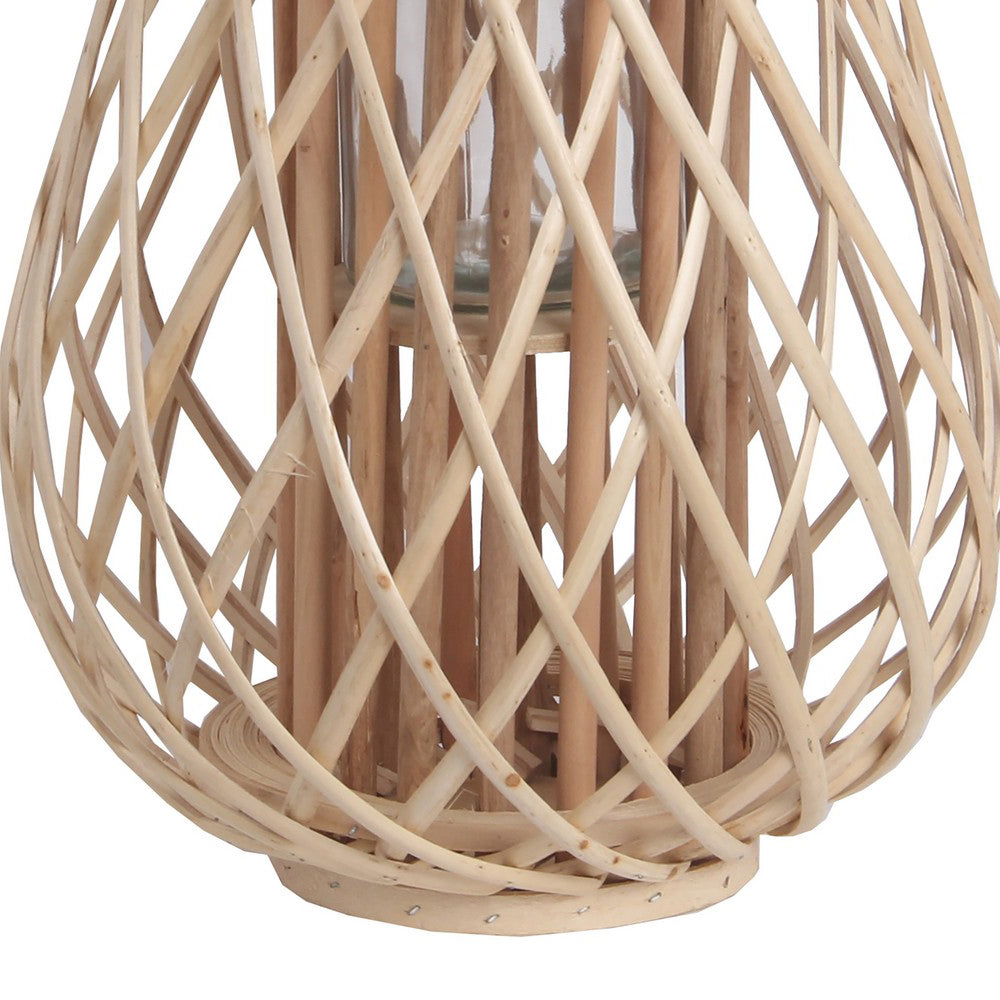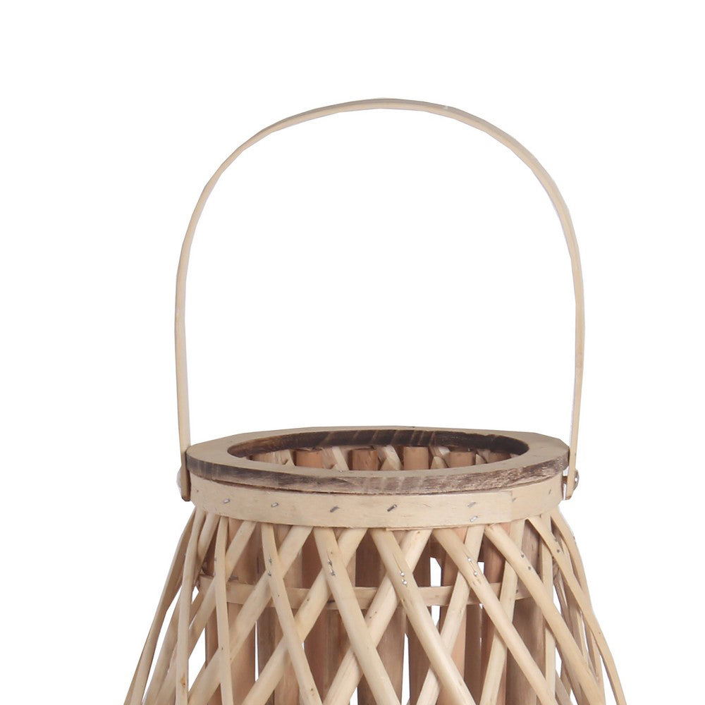 Enlighten your living room by lighting a candle with this elegant Lantern. Constructed from bamboo in a natural brown finish and showcasing a bellied shape, it features a lattice design and woven banded top. The curved handles are provided for hanging purposes.