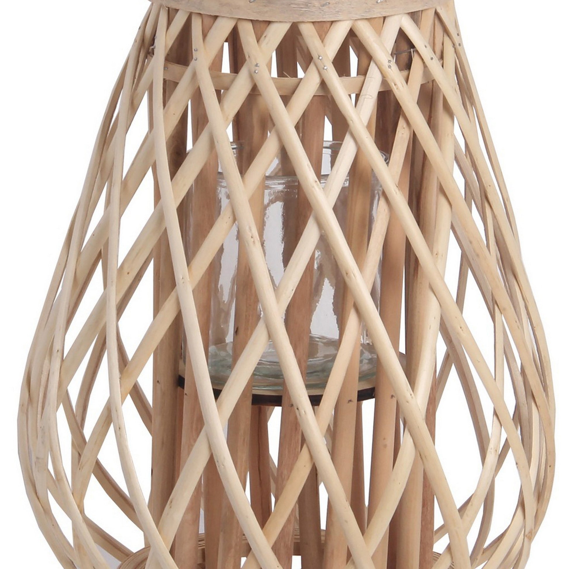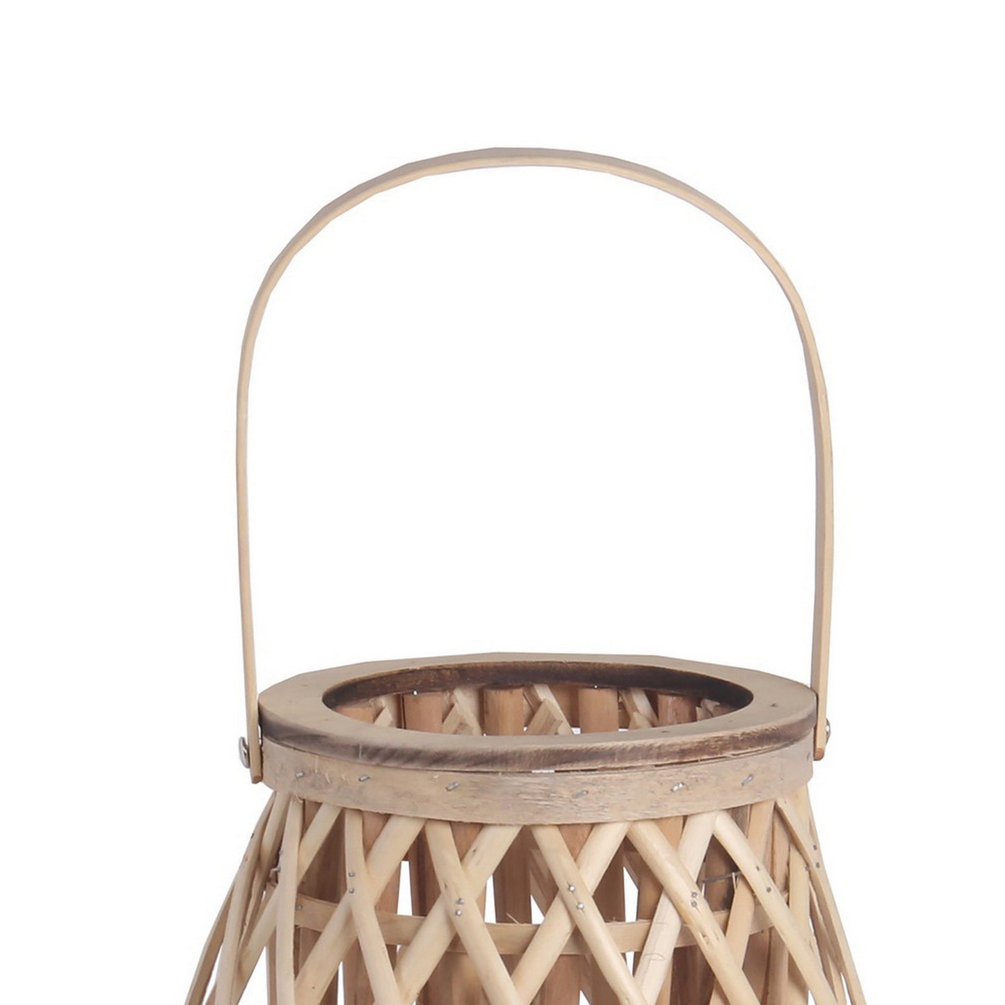 Enlighten your living room by lighting a candle with this elegant Lantern. Constructed from bamboo in a natural brown finish and showcasing a bellied shape, it features a lattice design and woven banded top. The curved handles are provided for hanging purposes.