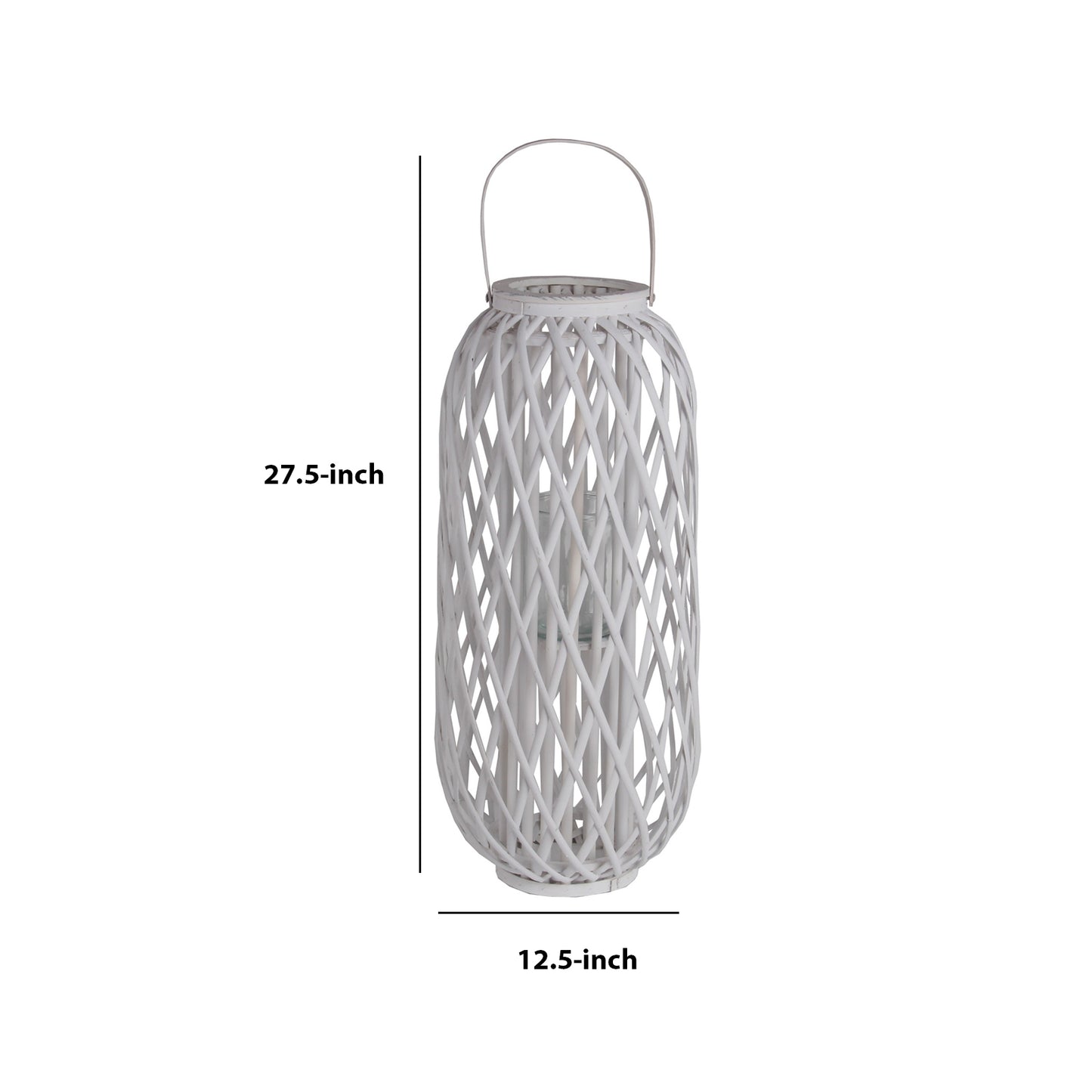 Enlighten your home and create a pleasant space with this bamboo made lantern. Incorporated with curved design handle for hanging, it has banded round top and open lattice frame which completes its look. The glass hurricane is provided for holding candles.