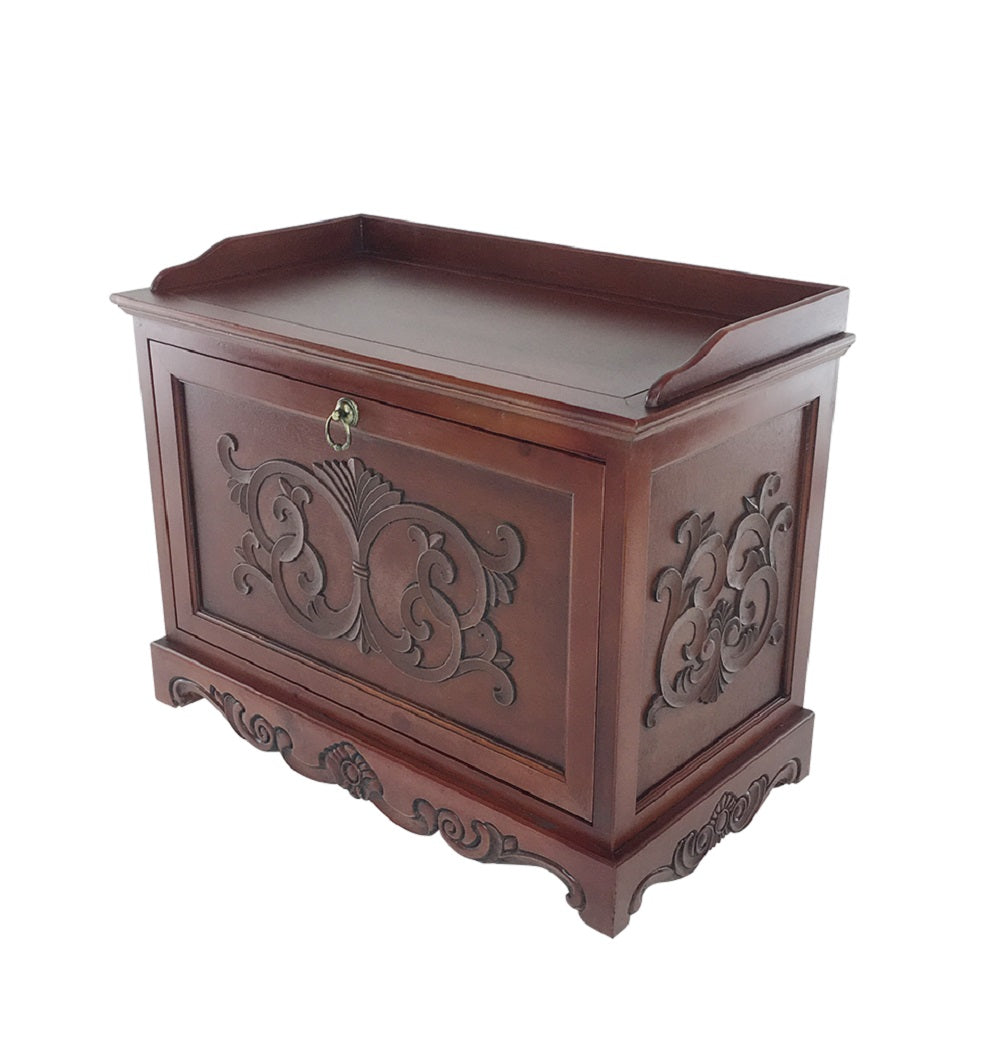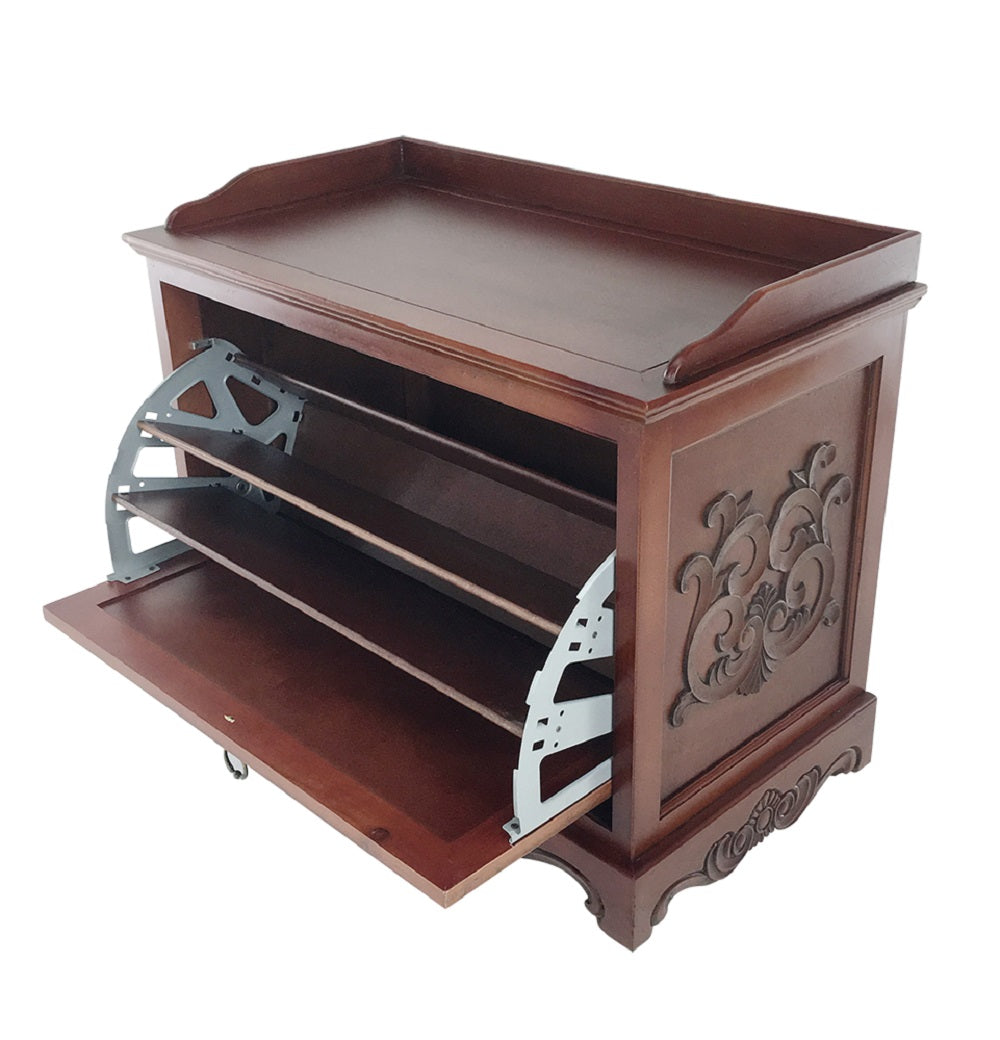 Allow this Bentley Shoe Cabinet to welcome you at the entrance of your home as you begin to unwind and rest. By your front door you can store your work shoes as you slid into your comfy house shoes. In your room this cherry brown colored wood cabinet is a stylish and practical storage solution for your shoe collection at the foot of the bed. While helping to keep you organized, this cabinet is not only functional but also adds a touch of elegance with the carving around the front and sides of the cabinet. The dropdown lid will reveal three separate dividers and with no assembly required, you can simply find the perfect location to start using it fast and easy.