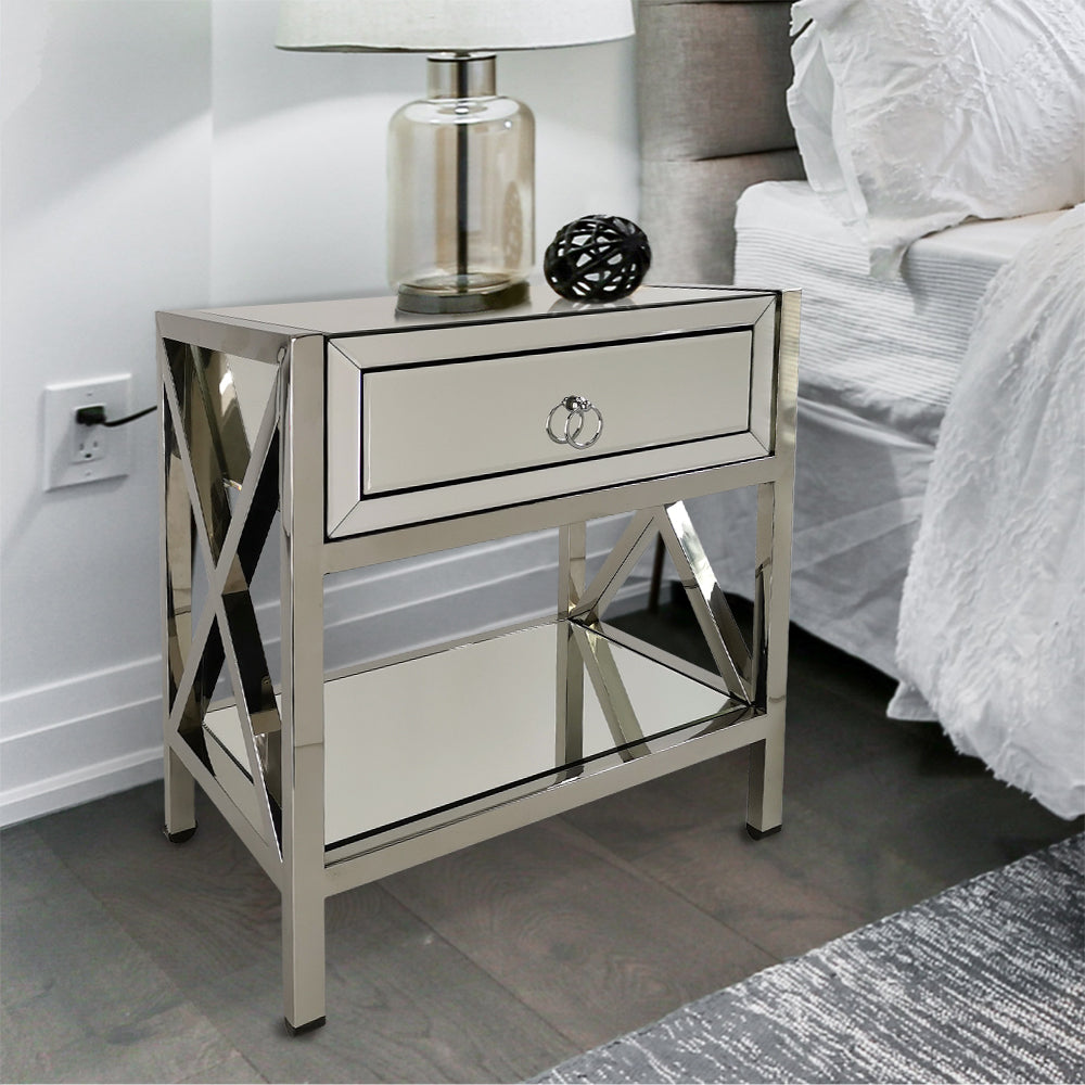 Beautifully crafted mirror stand that can be used as a night stand, storage space or accent table in any room. Crafted with a chromed metal frame and mirror wrapped around all side this piece will add glam-inspired look the any style. The open space can be used to display a delicate figurine or a prized décor visible from all sides including the "X" shape chrome sides.