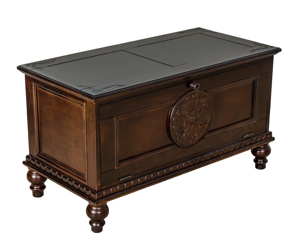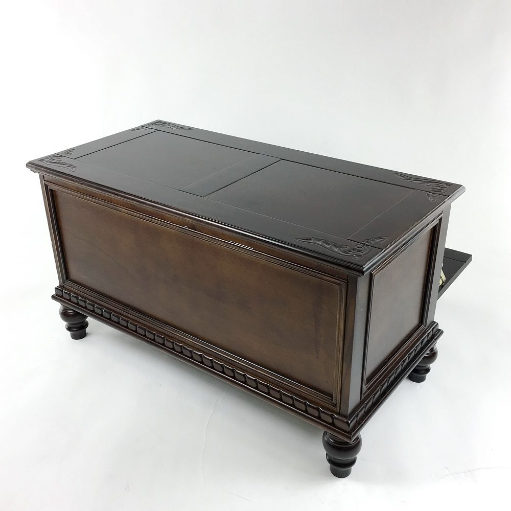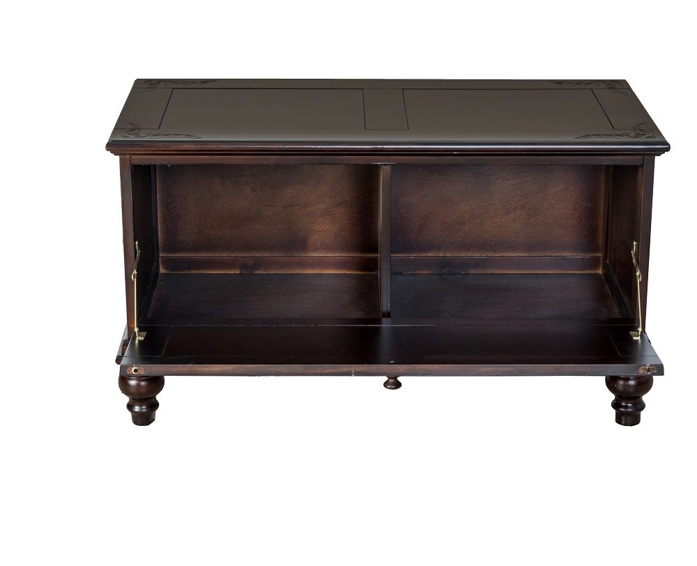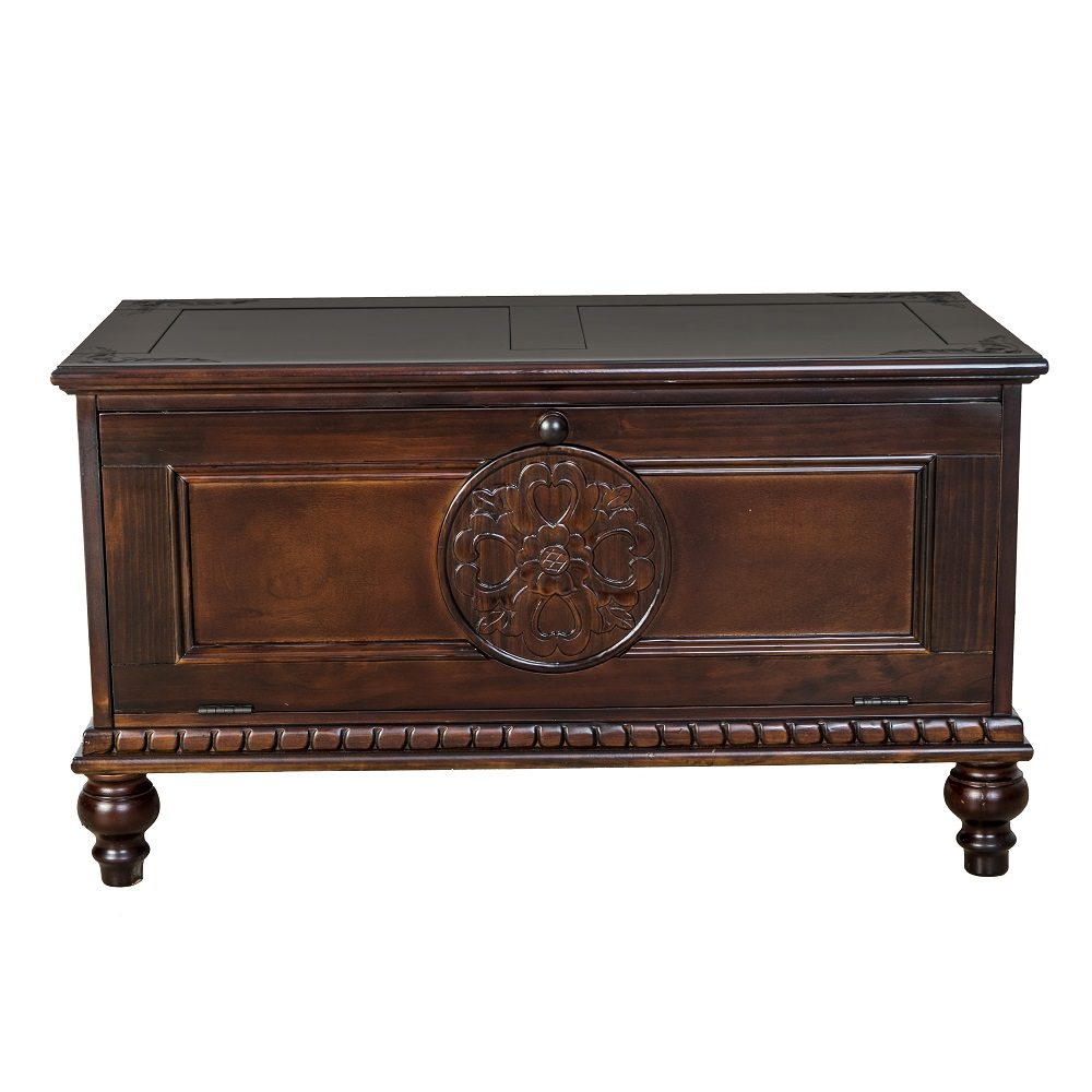 This beautiful wooden trunk with a drop down door opens up to two ample separate storage spaces. While organizing in style this trunk can be used at the front entrance of your home or in a bedroom at the foot of the bed with its delicate carving it will compliment your current home décor. The space behind the drop-down lid on this chest can hold anything from extra blankets, shoes or just as a resting place before you slip off your shoes and enter your home. You will love its neutral, clean lined look and with its unique antique feel to this trunk will become a beloved furniture piece in any room it is placed in.