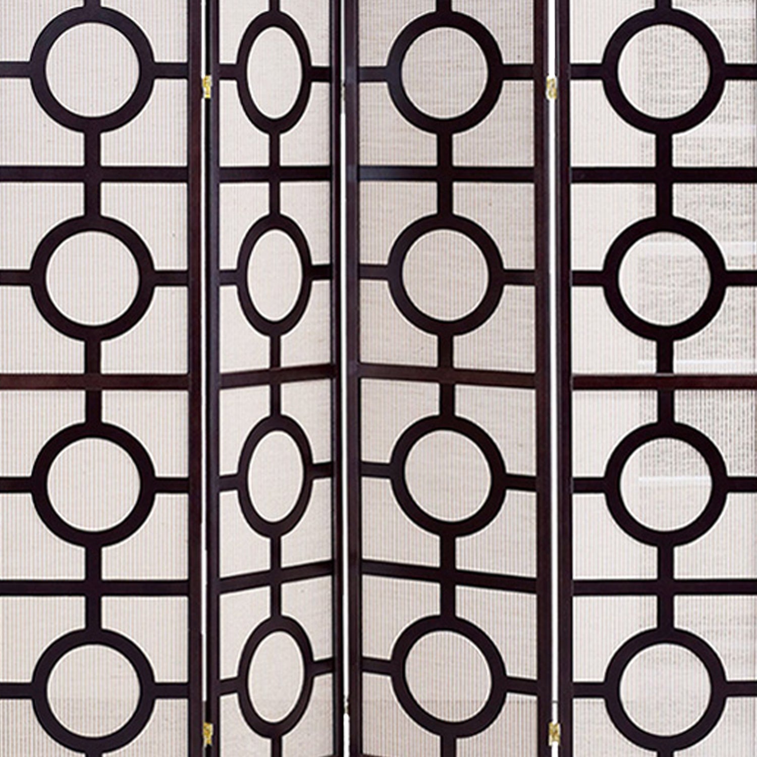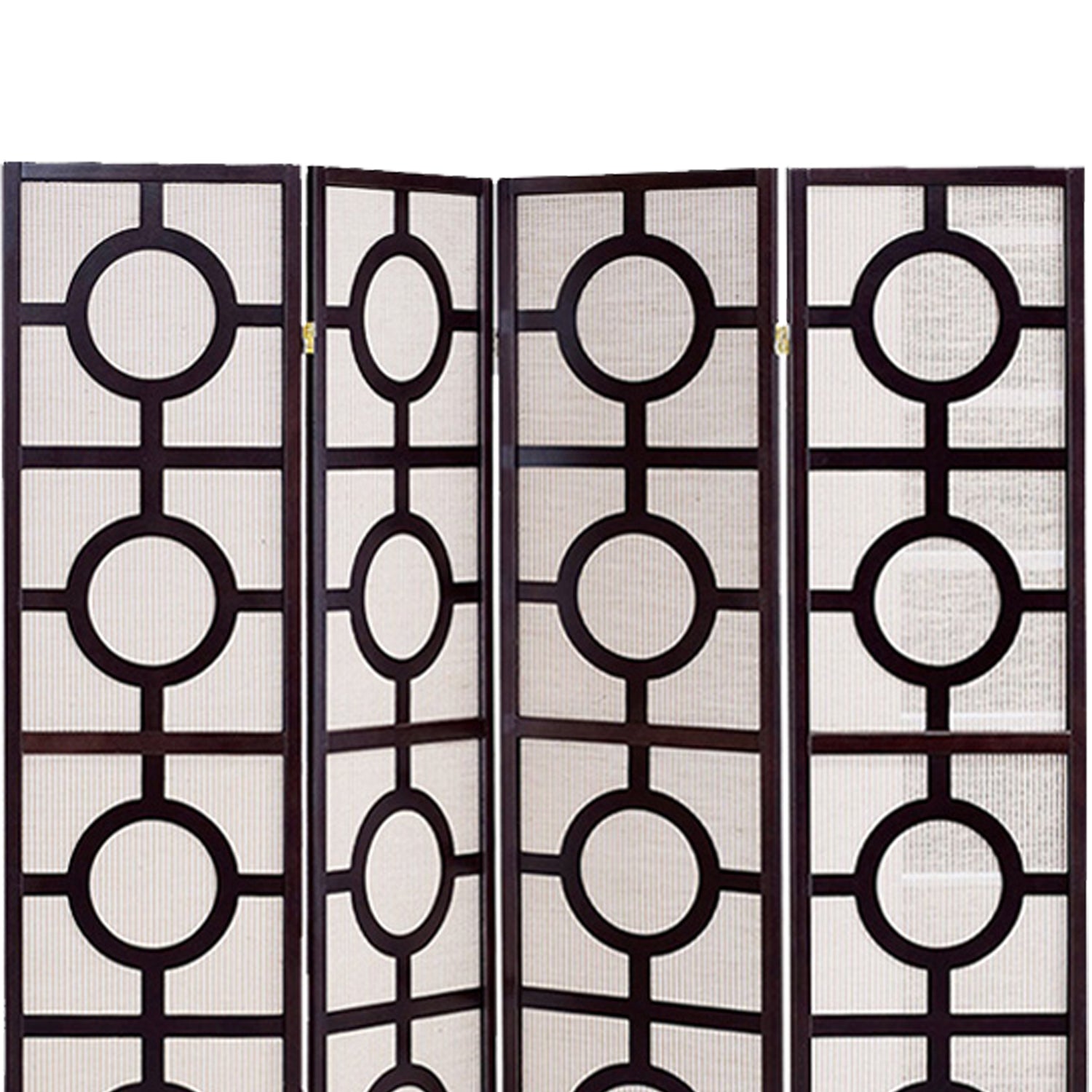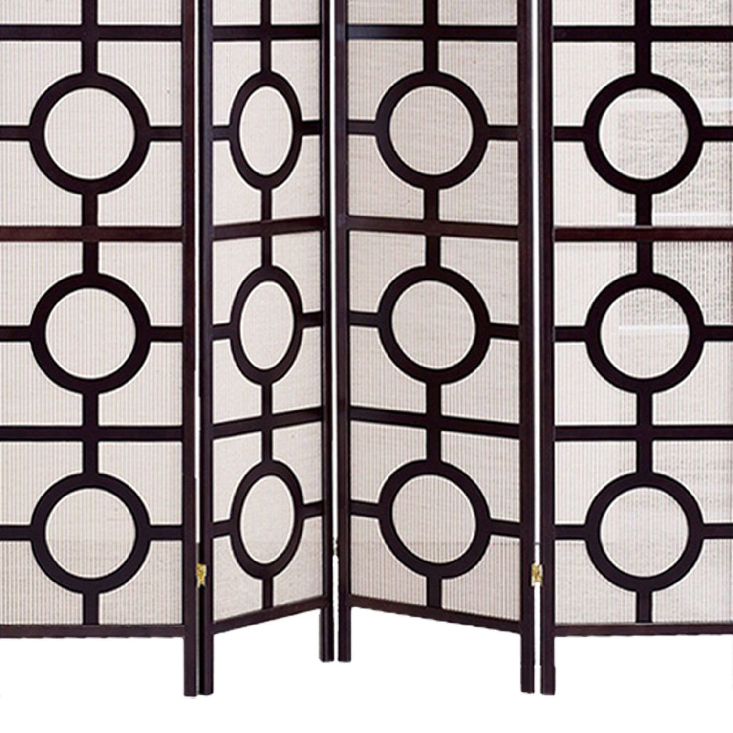 Circular Motif Wooden 4 Panel Room Divider with Jute Inlays, White and Brown