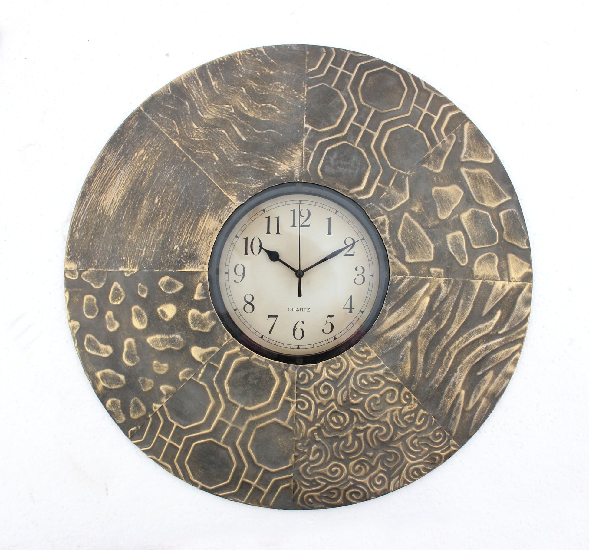 Keep the track of right time with this amazing wall clock loaded with craft and design. It features a round metal frame construction in Brown finish showcasing multiple patterns. The frame encloses a round clock with standard numerals and spade type hands.