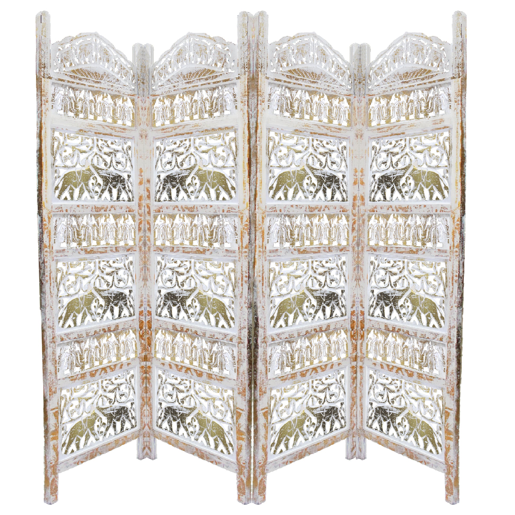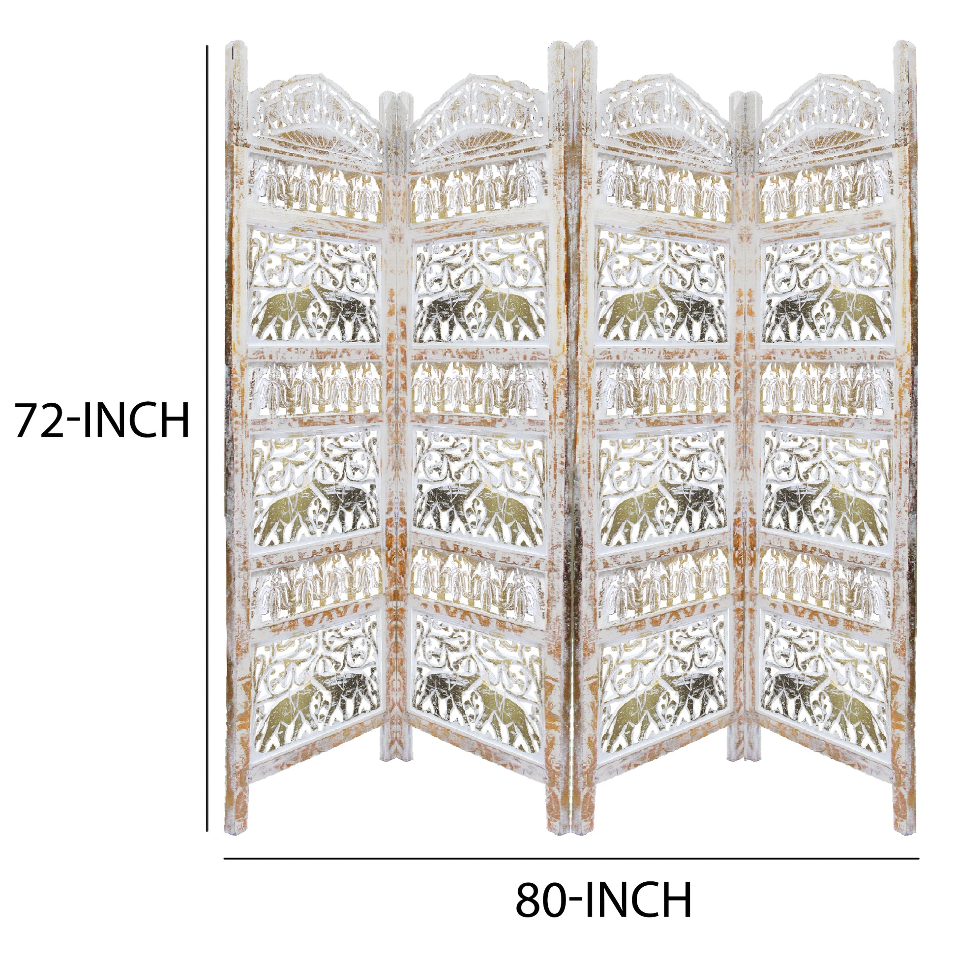 Classic 4 Panel Mango Wood Room Divider with Elephant Carvings, Gold and White