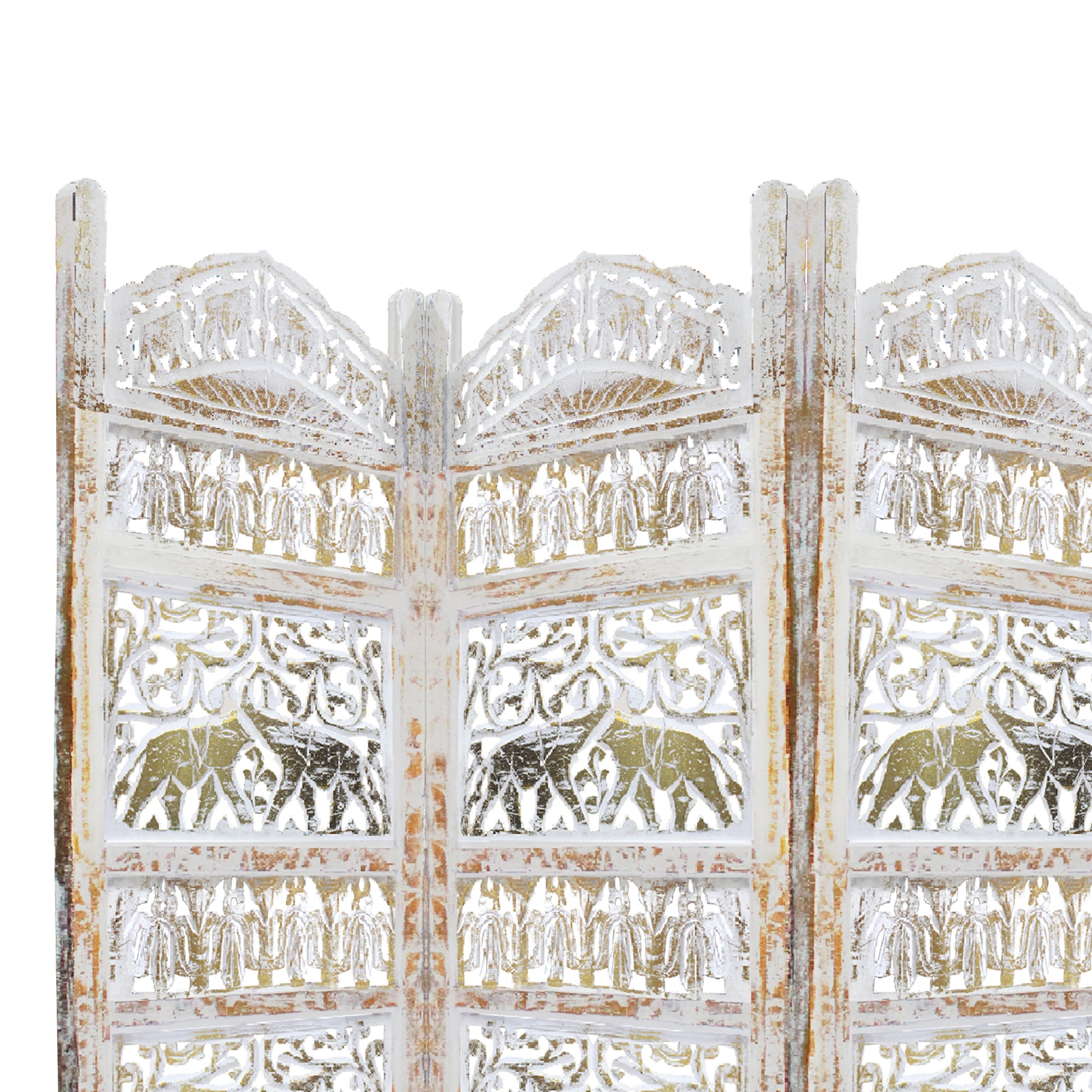 Bring home this beautifully hand carved room divider, featuring cutout scrolled pattern and elephant carvings that add to its classic charm. Helps in creating a separate corner within your interiors, it divides any large spacious room gracefully and create a charismatic vibe all around. This room divider is made of quality MDF and mango wood, accented with weathered gold and white finish. This 4 panel screen with hinged joints offers a great place in your living room or bedroom space. Due to the handcrafted nature of the product, there may be variations in color, finish, wood grain and knots.