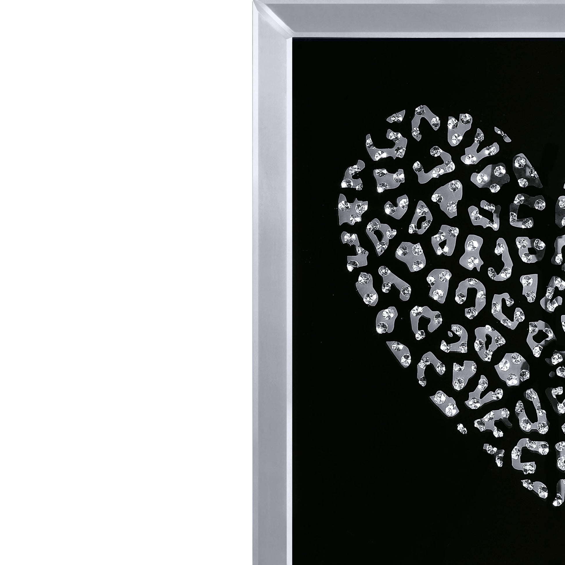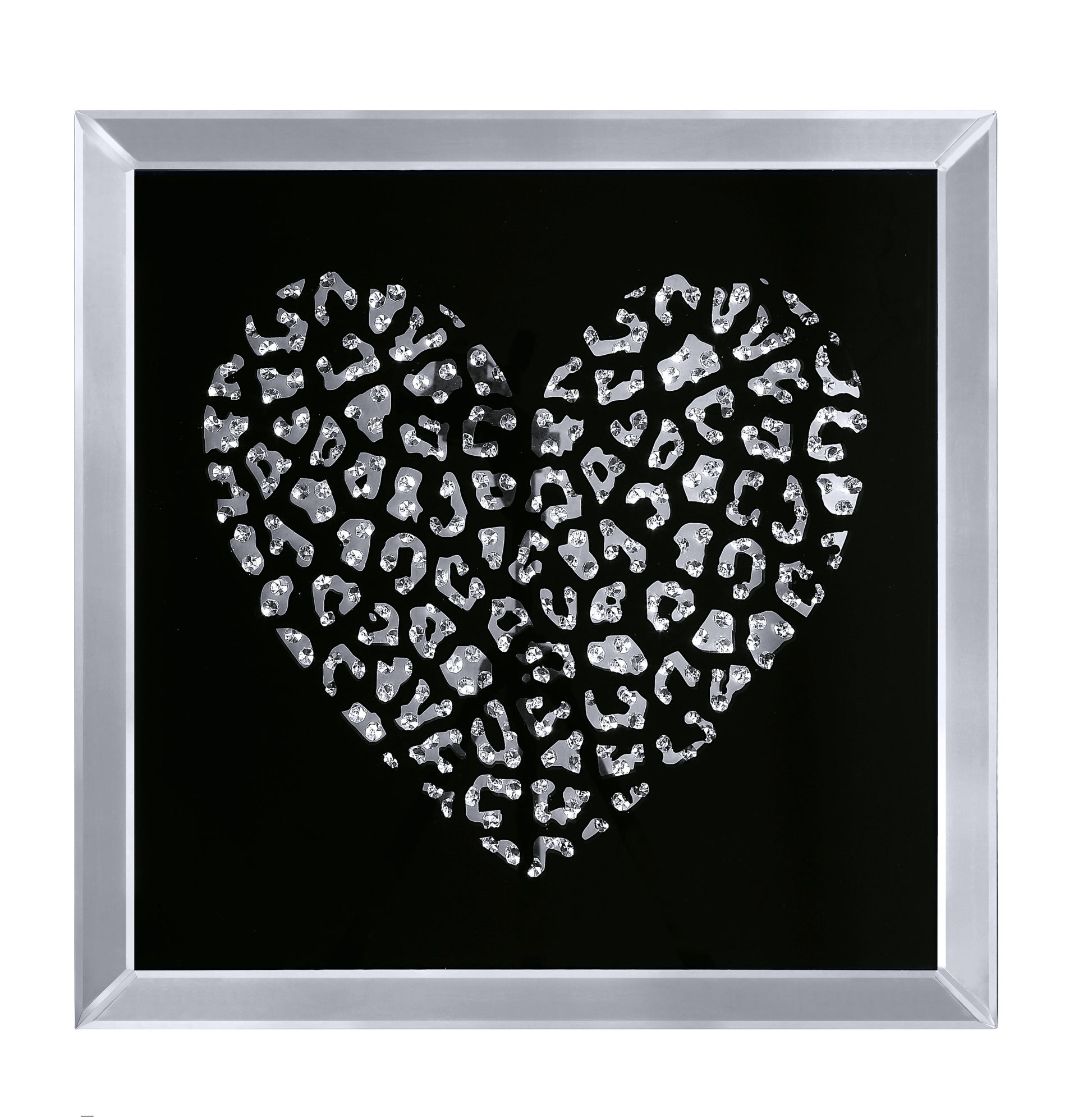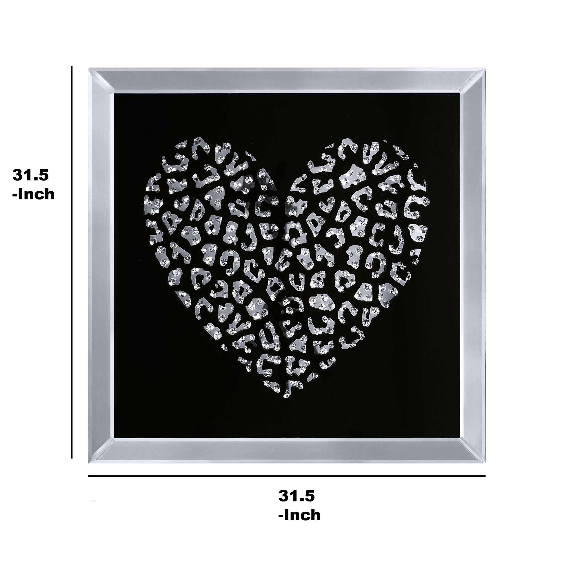 Add interest to your living space with this elegant Heart Wall Art. The dramatically casted heart shaped mirrors is the perfect contrast against its black background. Faceted optic glass faux crystals adorn the heart, layering it with added luxe and brilliance. To complete the look of this wall art, a beveled mirrored border frames the piece and creates an intricate play of light and refection. This Wall art is sure to be the focal point of any room. Note: Other featured items in image except this wall decor are sold separately.