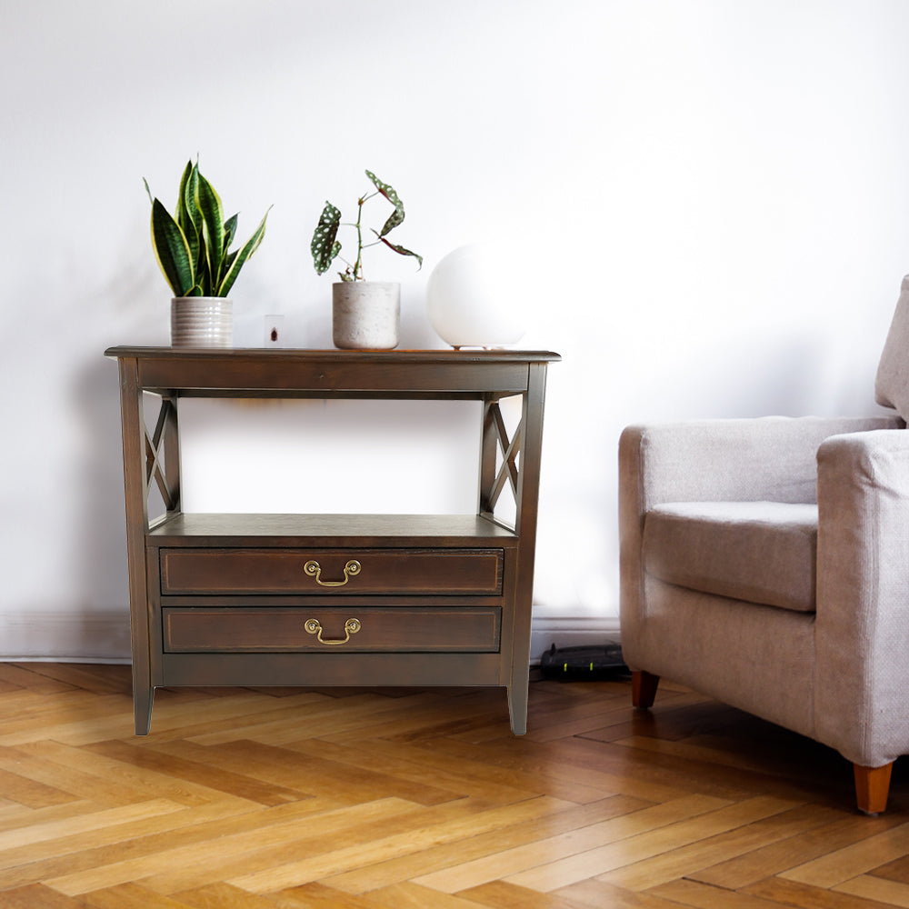 Catch up on the latest show, game or settle in for a movie marathon while making the most of a small space with this two drawer TV stand. A large open upper space with an X-shaped accent you can store all your media equipment including game consoles or cable boxes.