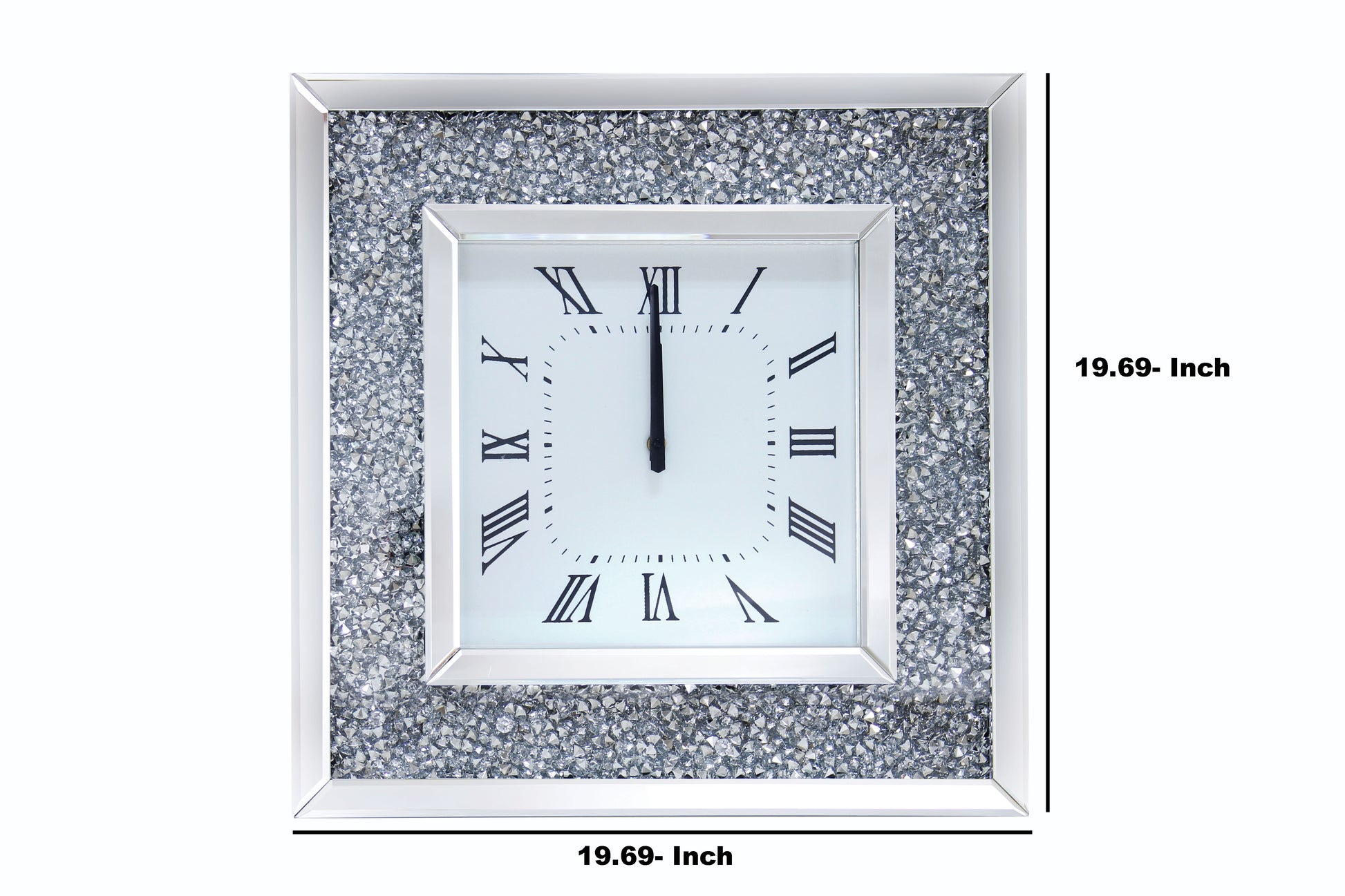 Make a style statement when you mount this contemporary Analog Wall Clock to any wall of your home. A stunning piece to use as a focal point, this easy to read clock features a unique beveled mirror lining with crushed faux crystals inlay that is sure to satisfy the most particular of tastes. This beautiful and contemporary wall clock will add an often overlooked decorative touch to any room and can be a great gifting solution as well.