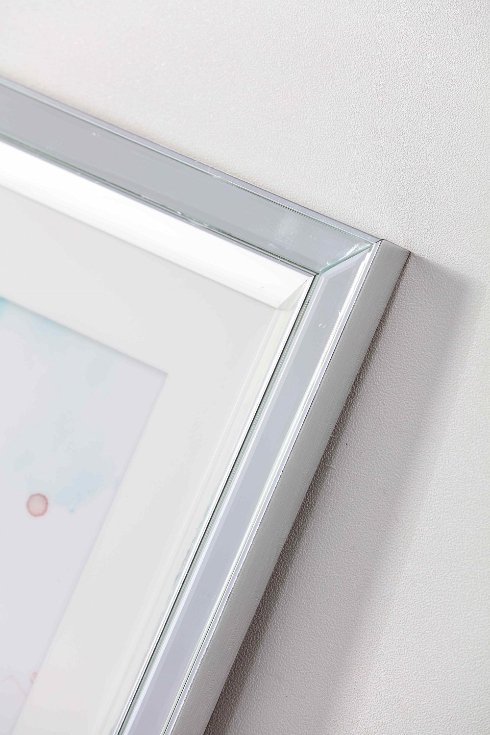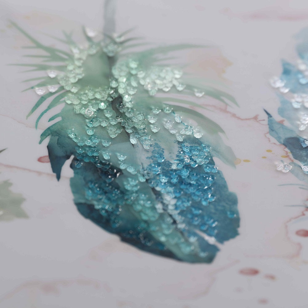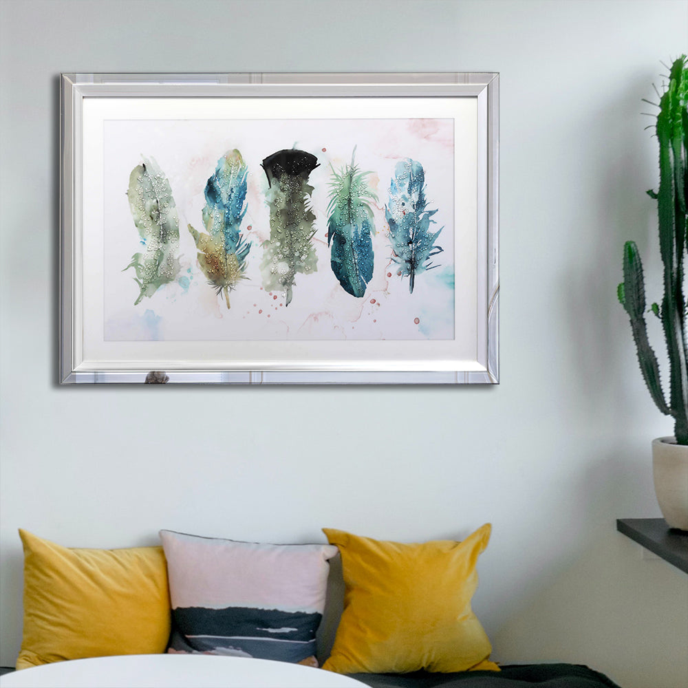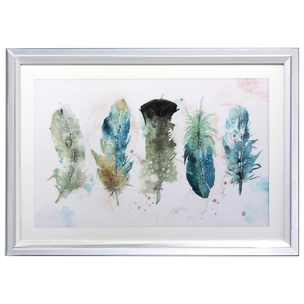 Bring life to you wall with this gorgeous silhouette of feathers featuring a glistening overlay. The clear droplets throughout the image show off a wonderful display of a glimmer effect over the painting. The acrylic frame of this painting is done with a textured edge, finished with thin mirror around it. Ready to be displayed right out of the box with attached D-rings.
