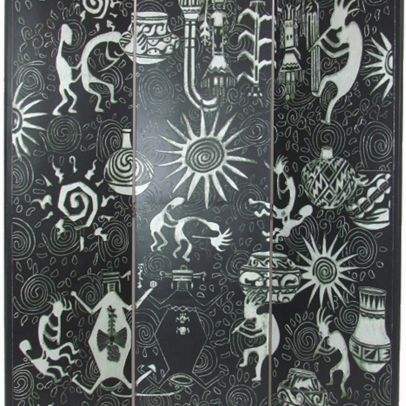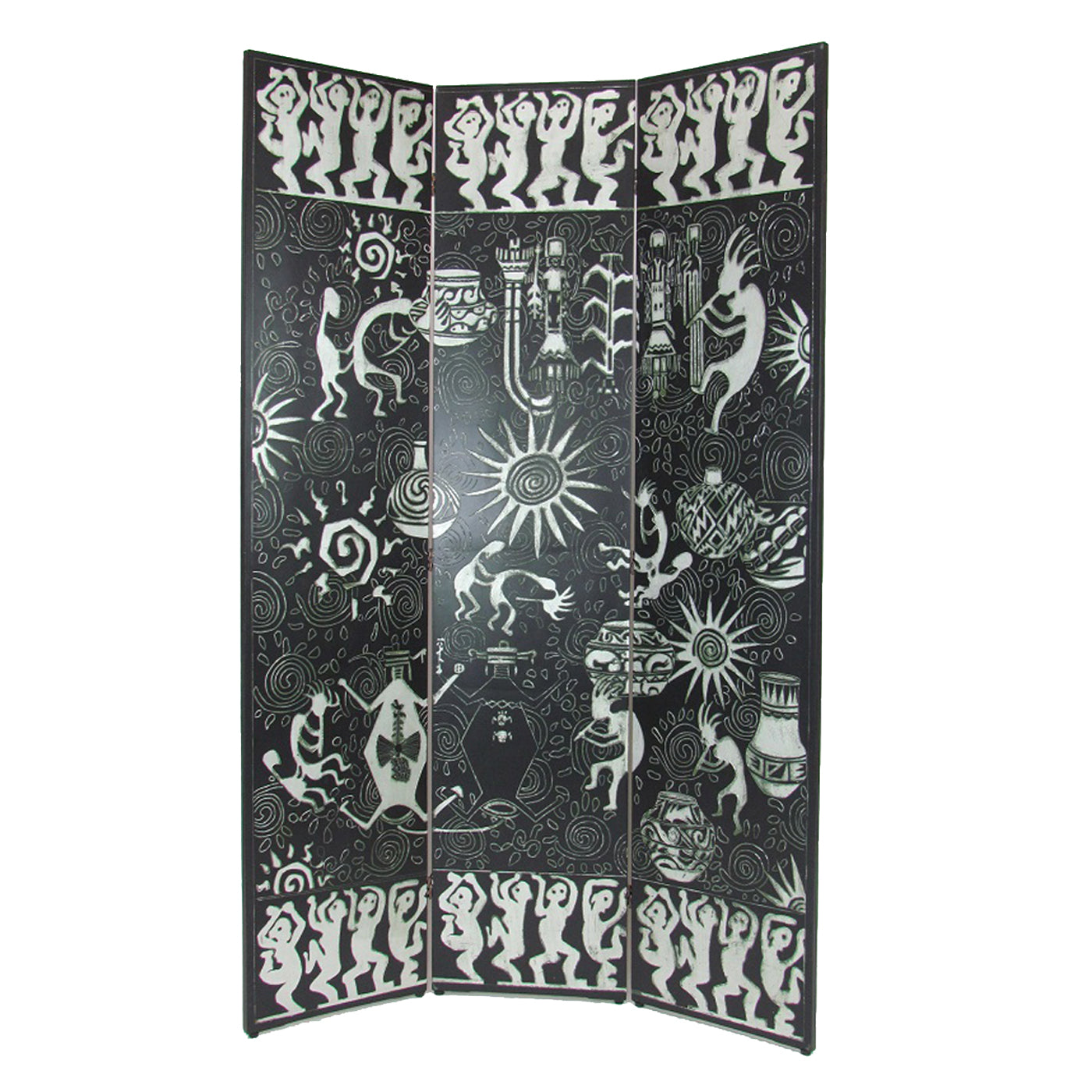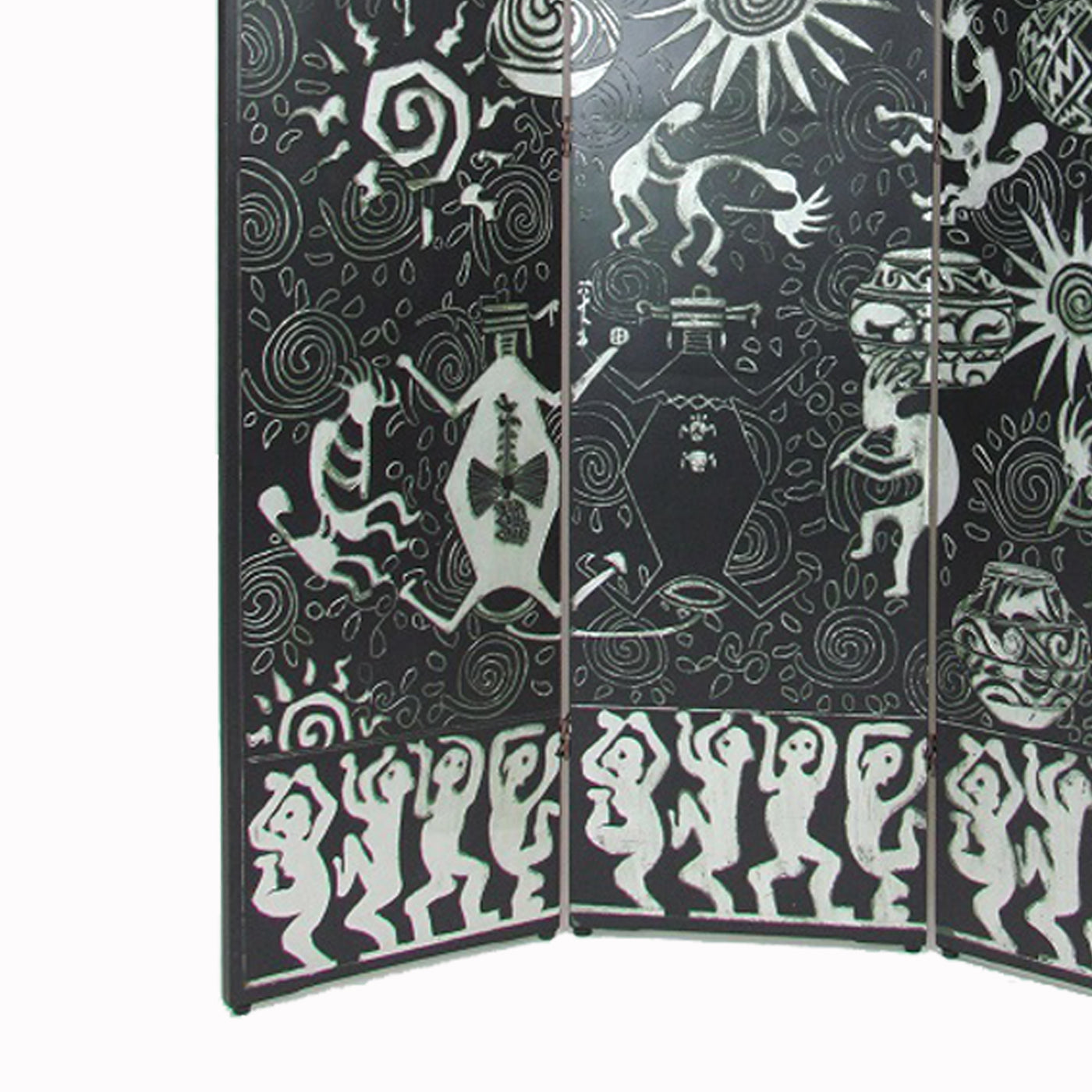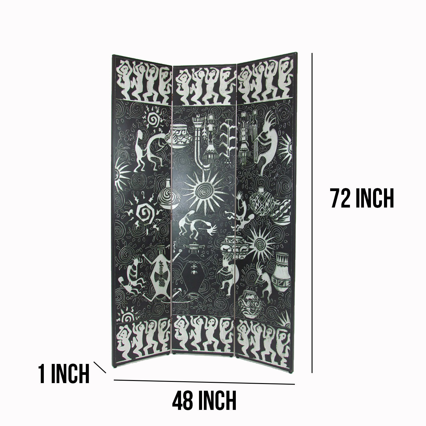 Foldable 3 Panel Room Divider with Tribal Print, Black and Silver