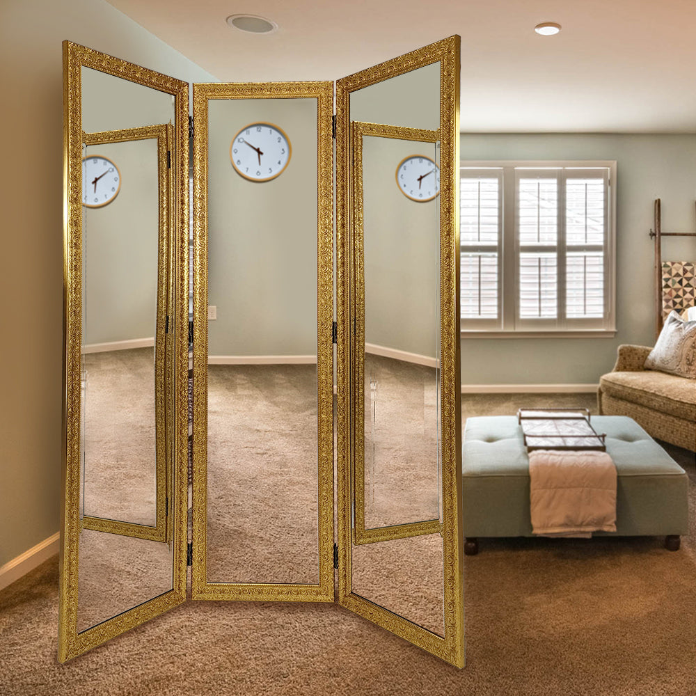 Enhance the look of your space with this beautiful golden vintage style full length mirror. With its double hinges you can fold the mirrors to fit any space from a corner to an open wall. This room divider has a clean sleek look and the gold trim details with bring elegance to the current décor in the room. While best in a bedroom you can place this mirror where you want to get a good last glance of your full attire. This full size floor mirror can be place in a room to open up the space and let the light bounce around the whole room. No matter where you place this room divider it will a pop of glamour to your current décor and will be a perfect addition to your home.