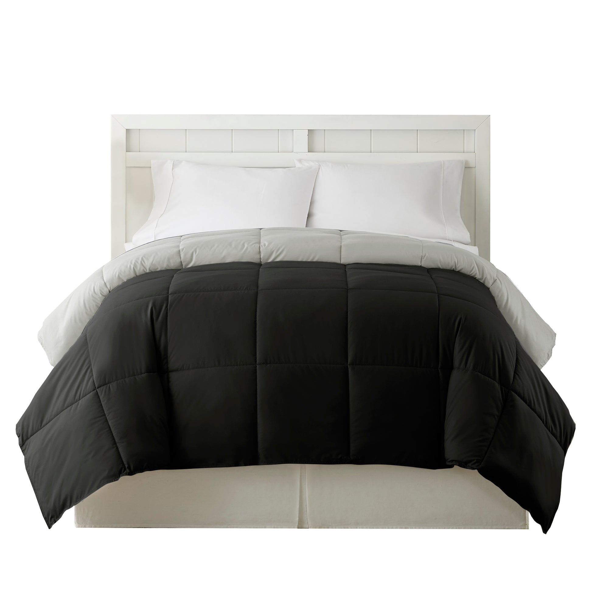 Update your bedroom look in style with the inclusion of this cozy king size comforter. Made from sumptuous and soft down alternative microfiber for a comfortable experience in elegant black and silver color. It features box quilted details which bestow an appealing look to the comforter. The machine washable feature saves the hassle of dry cleaning while the reversible attribute makes it a versatile and comfortable companion to your bed.