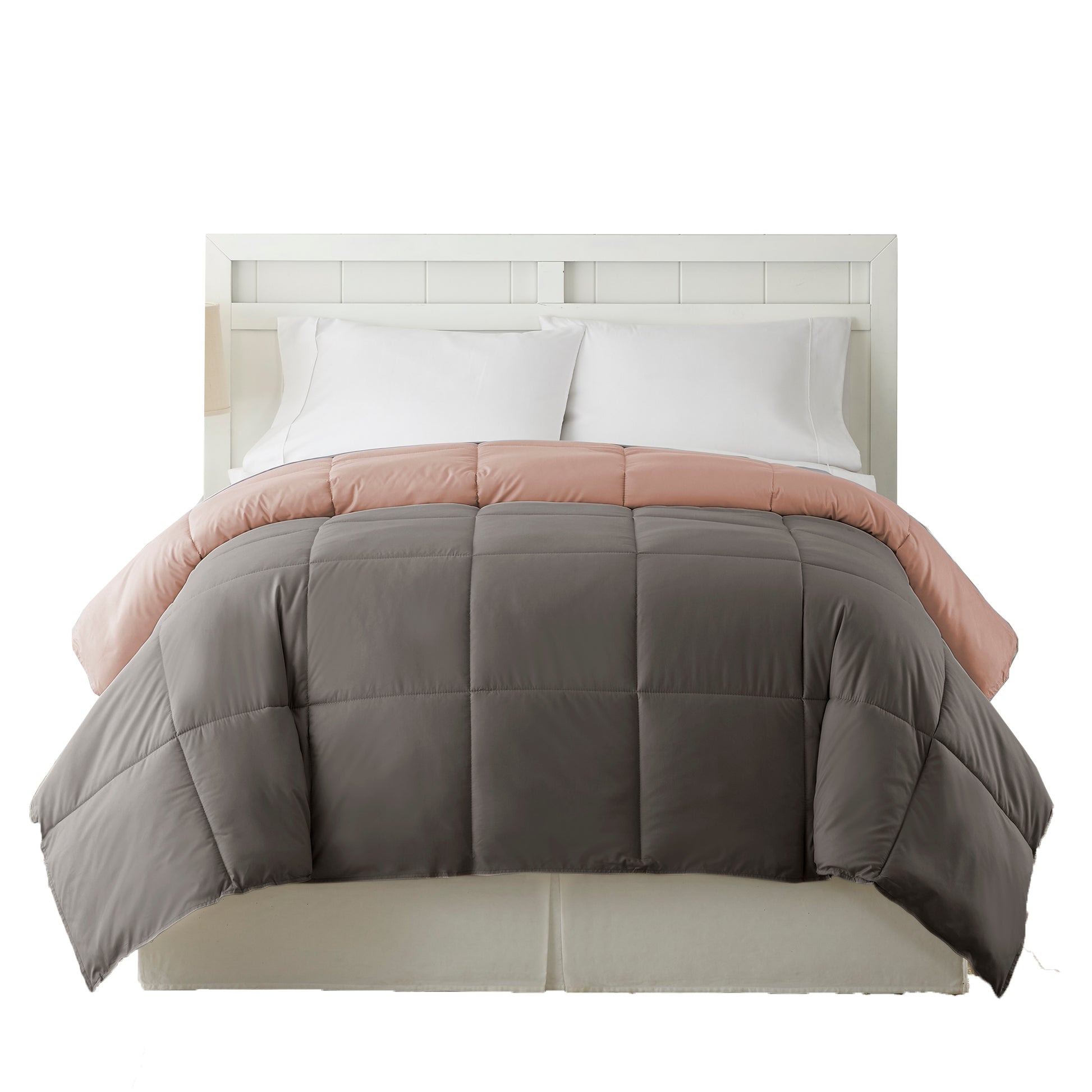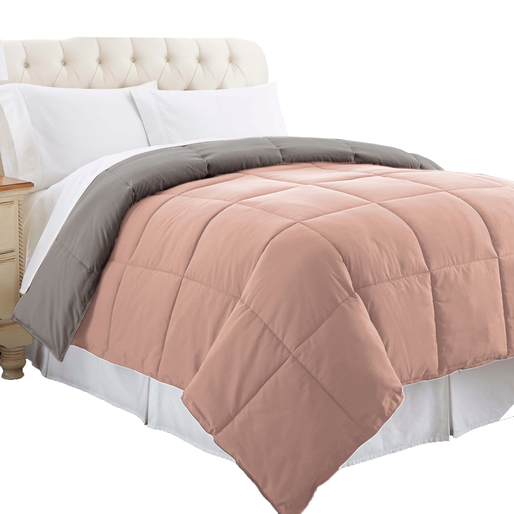 Update your bedroom look in style with the inclusion of this cozy queen size comforter. Made from sumptuous and soft down alternative microfiber for a comfortable experience in elegant gray and pink color. It features box quilted details which bestow an appealing look to the comforter. The machine washable feature saves the hassle of dry cleaning while the reversible attribute makes it a versatile and comfortable companion to your bed.