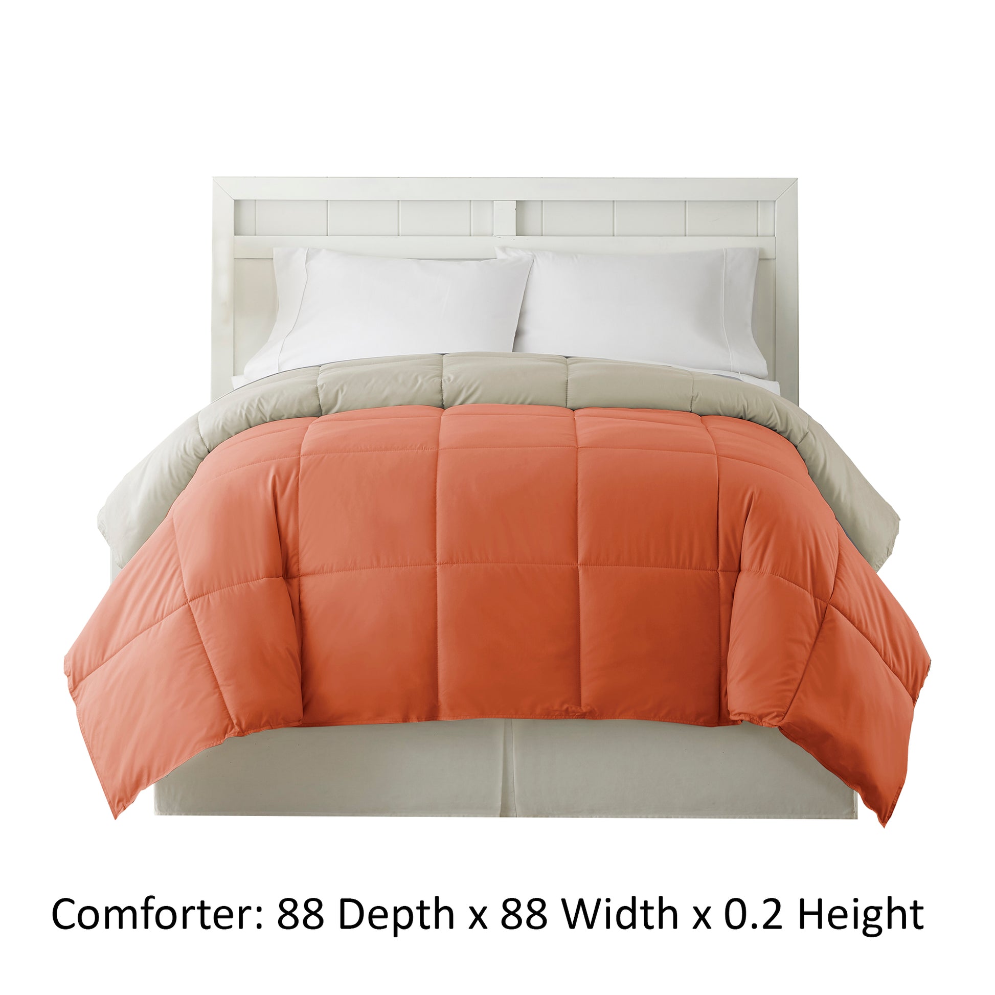 Update your bedroom look in style with the inclusion of this cozy queen size comforter. Made from sumptuous and soft down alternative microfiber for a comfortable experience in elegant orange and gray color. It features box quilted details which bestow an appealing look to the comforter. The machine washable feature saves the hassle of dry cleaning while the reversible attribute makes it a versatile and comfortable companion to your bed.