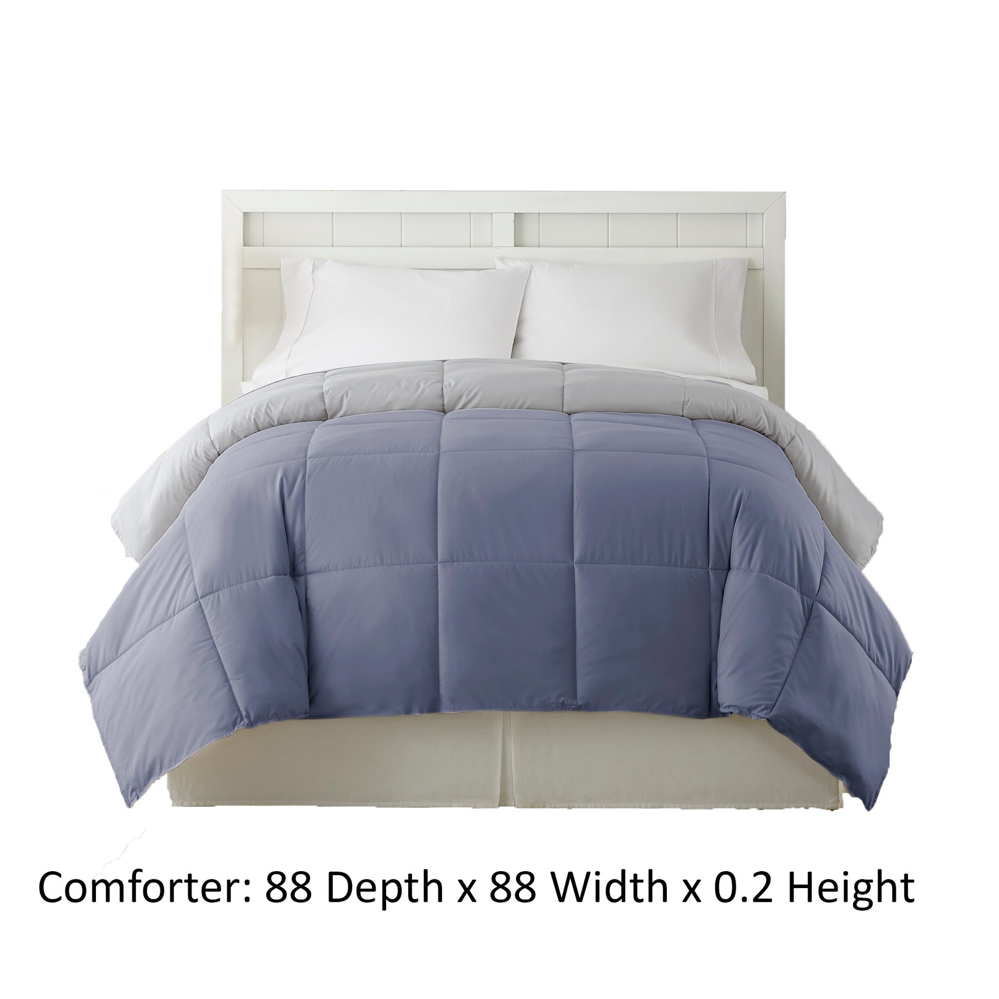 Update your bedroom look in style with the inclusion of this cozy queen size comforter. Made from sumptuous and soft down alternative microfiber for a comfortable experience in elegant silver and blue color. It features box quilted details which bestow an appealing look to the comforter. The machine washable feature saves the hassle of dry cleaning while the reversible attribute makes it a versatile and comfortable companion to your bed.