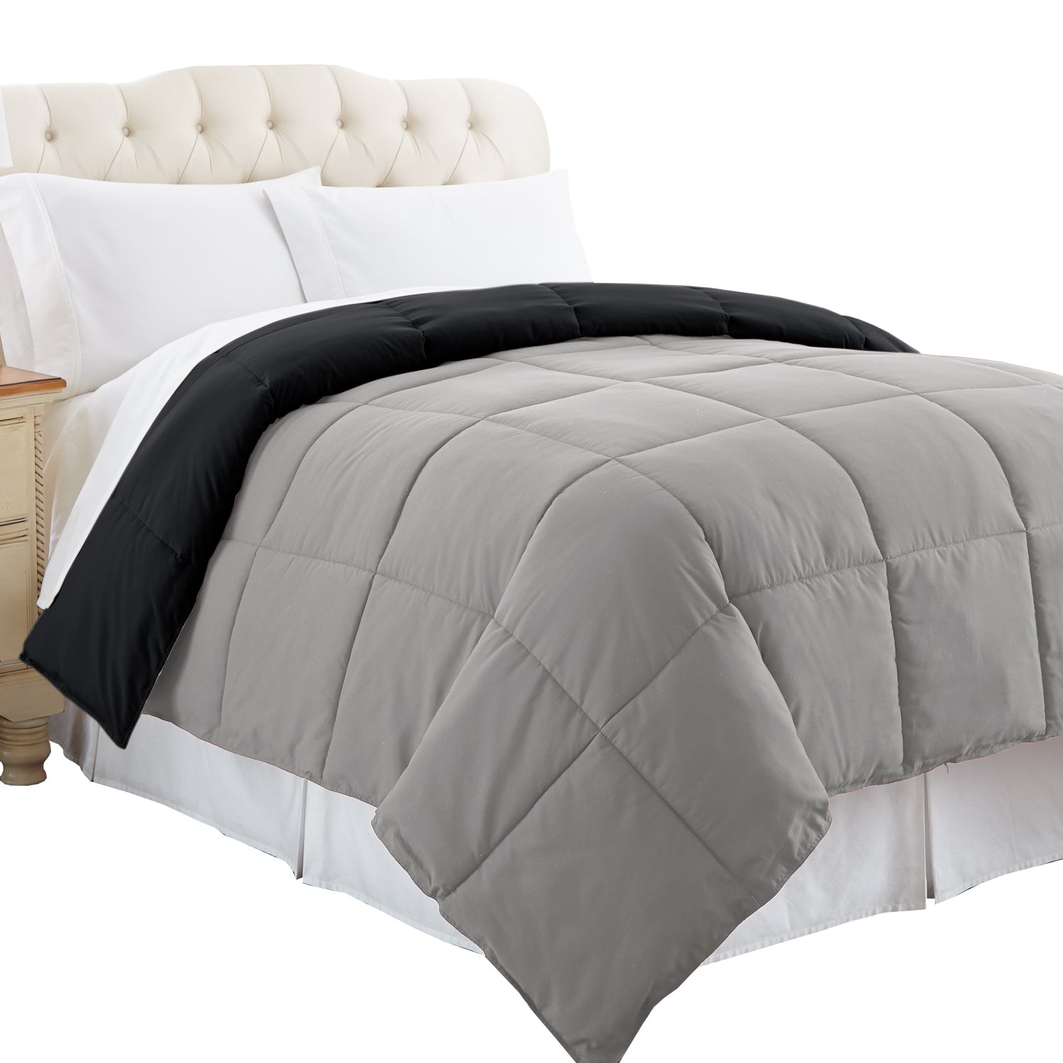Update your bedroom look in style with the inclusion of this cozy twin size comforter. Made from sumptuous and soft down alternative microfiber for a comfortable experience in elegant black and silver color. It features box quilted details which bestow an appealing look to the comforter. The machine washable feature saves the hassle of dry cleaning while the reversible attribute makes it a versatile and comfortable companion to your bed.