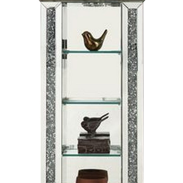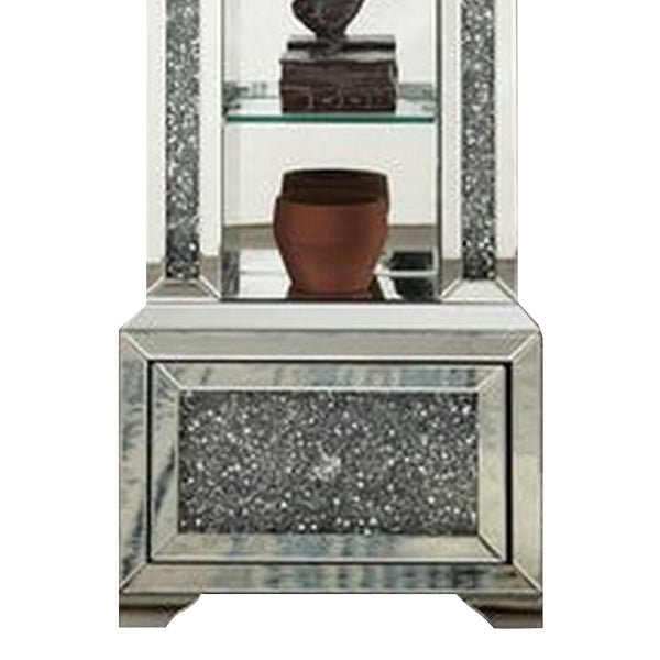 Classic and timeless, this grandfather clock with roman numerals and two minimalist hands will be a compelling centerpiece in any living space. It has a beveled mirror framing that brings in style and elegance. The 3 tier shelves and pull out drawer offer handy storage space whereas the faux diamond accents add lightness to the design. This grandfather clock fits seamlessly into any room.