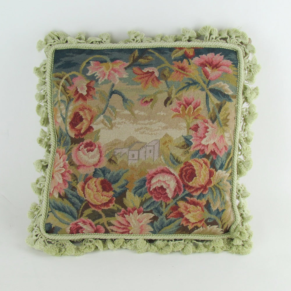 Hand Stiched Pink Flower Needle Point Pillow Needle Point Pillow