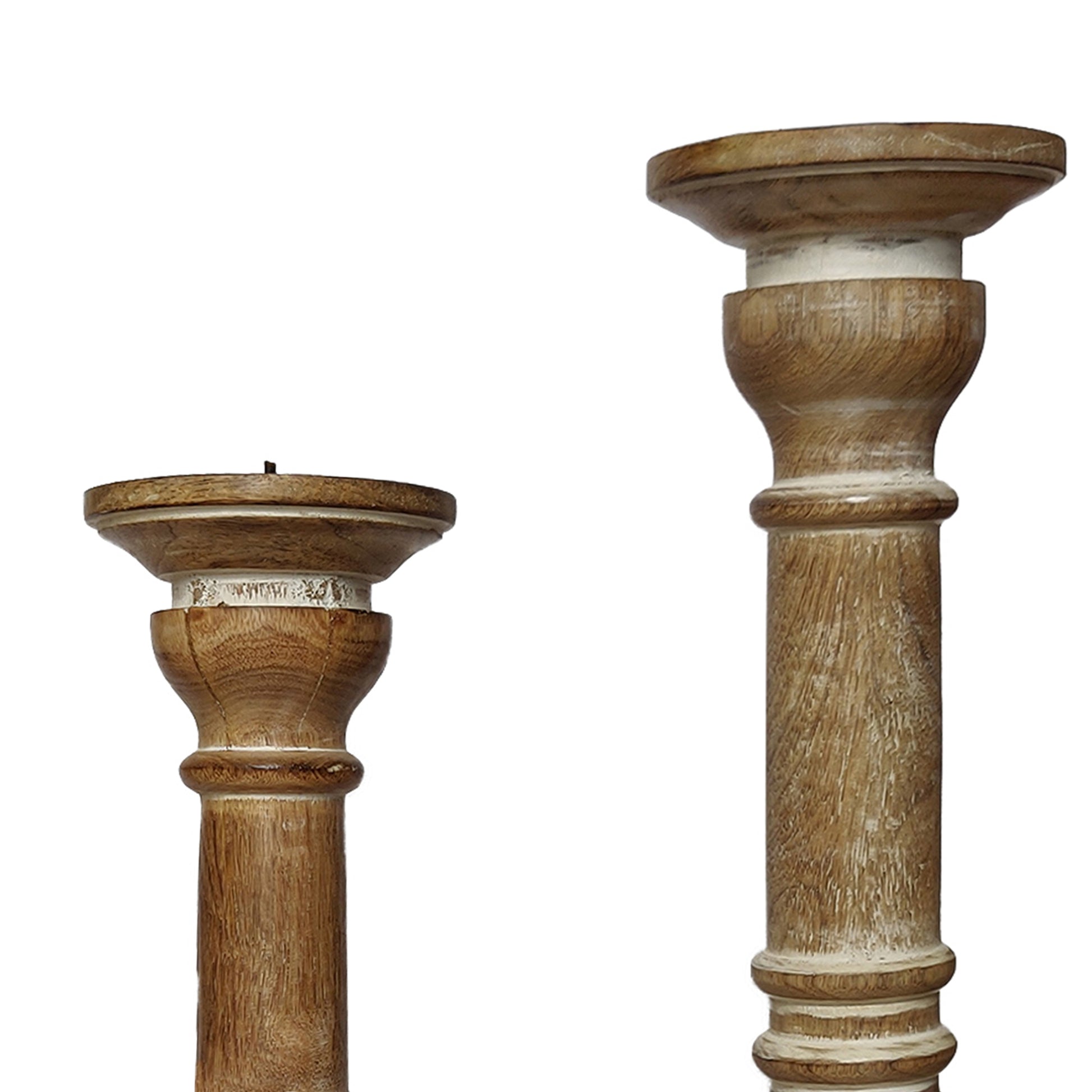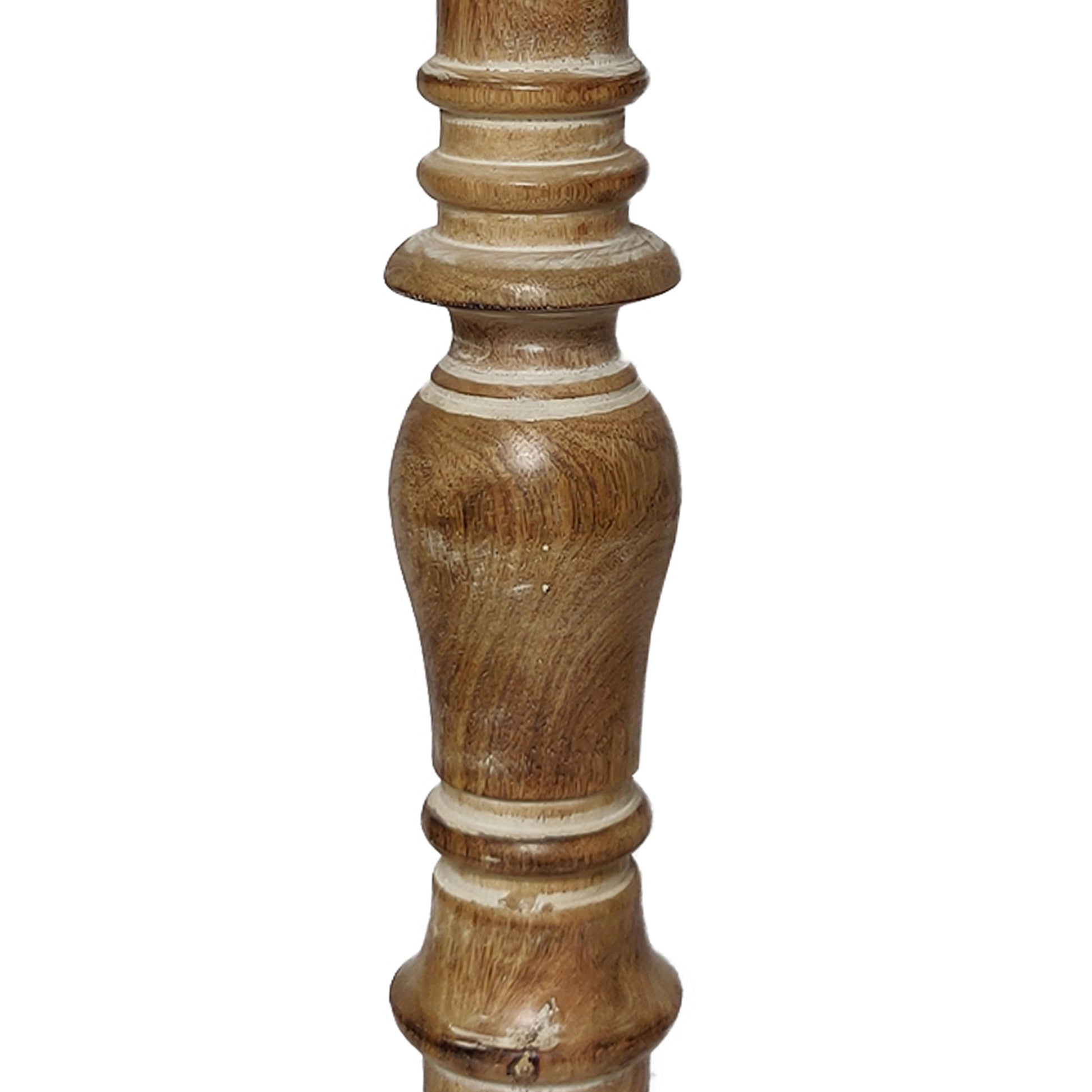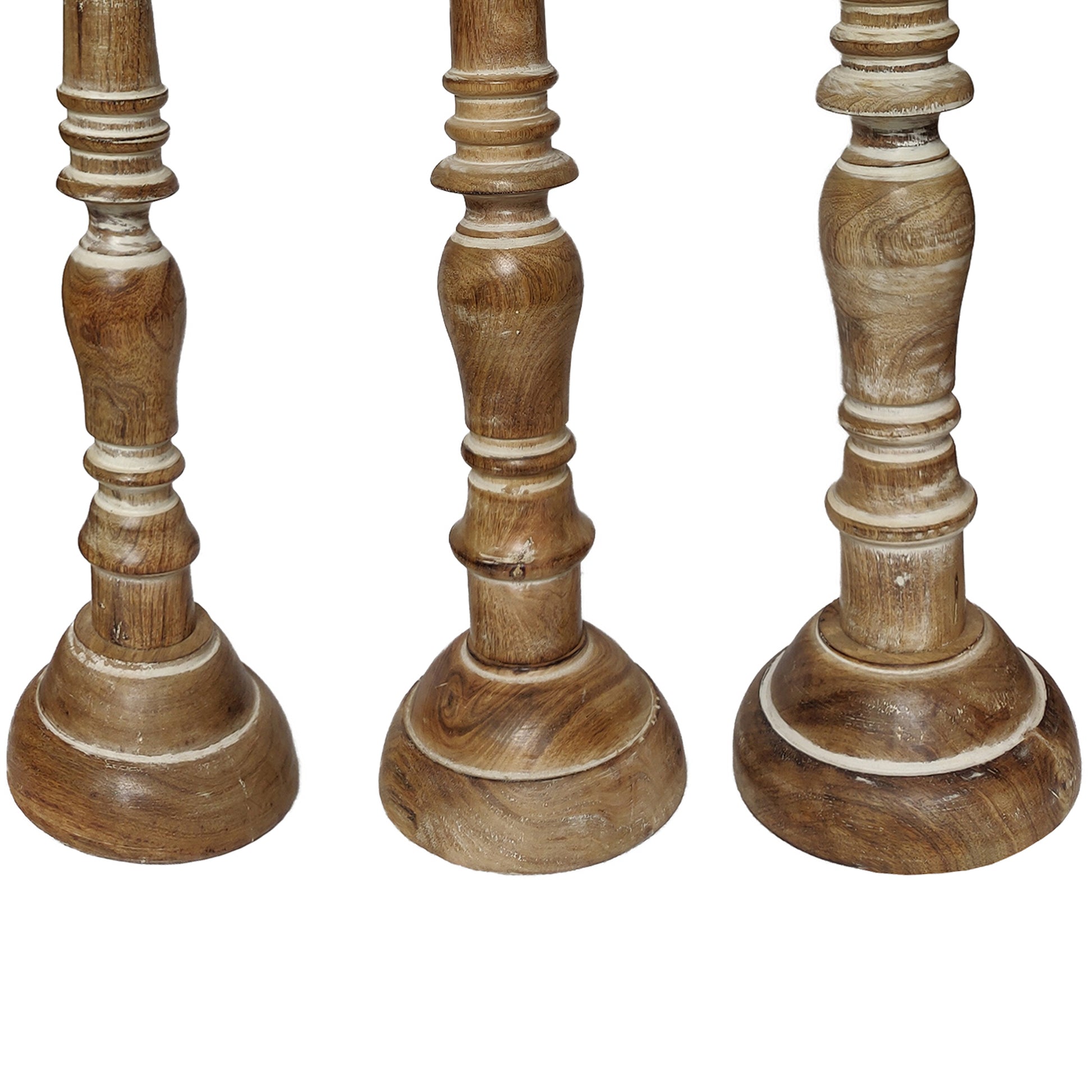 Illuminate your interior decor with the inclusion of this traditionally designed set of 3 candle holders, handcrafted from natural brown finish wood and complemented with a distressed white finish. This pedestal shape candle holder features classic turned designs paired with ribbed detailing and iron plated flared top provides great support to your candles. This candle holder is designed to complement the classic setting of your home or office. Due to the handcrafted nature of the product, there may be variation in color, finish, wood grain and knots.