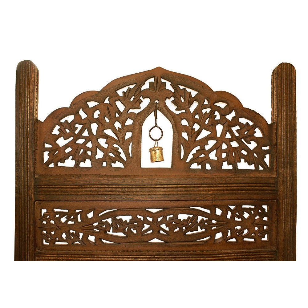 Make the most efficient use of room's space with the inclusion of this wooden room divider screen. This room divider is made up of mango wood and features an excellent intricate carved work on both sides thus making this reversible. This room divider is finished in antiqued brown finish while the four panels feature tiny bells in a beautiful pattern. Featuring foldable nature which allows easy store when not required.