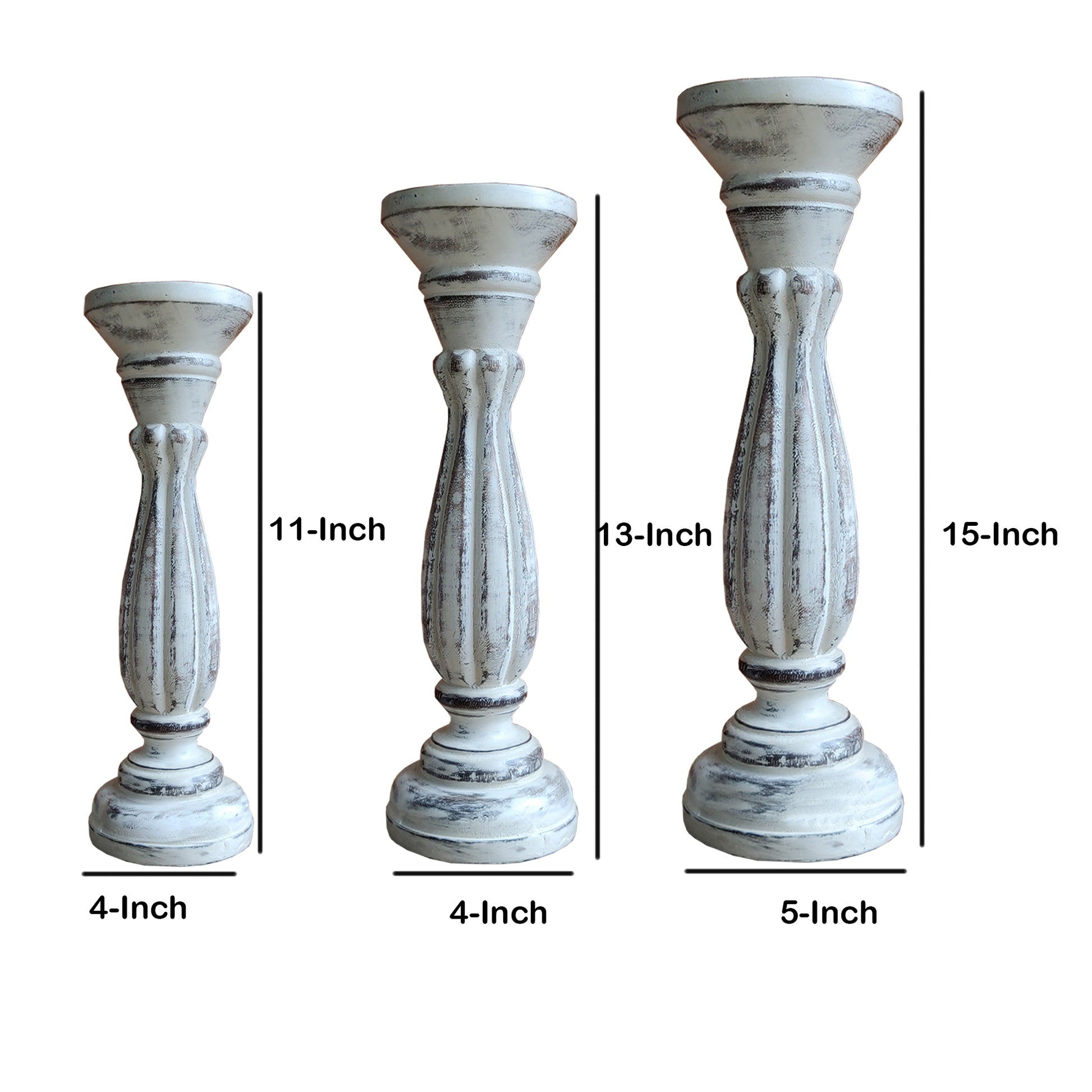 Brighten up your home interior with the inclusion of this classic design set of 3 candle holders. Handcrafted from wood with a distressed white finish, this pillar shape candle holder features classic tapered design paired with deep vertical grooving on its body and iron plated flared top that provides great support to your candles. This candle holder is designed to complement the classic setting of your home or office. Due to the handcrafted nature of the product, there may be variation in color, finish, wood grain and knots.
