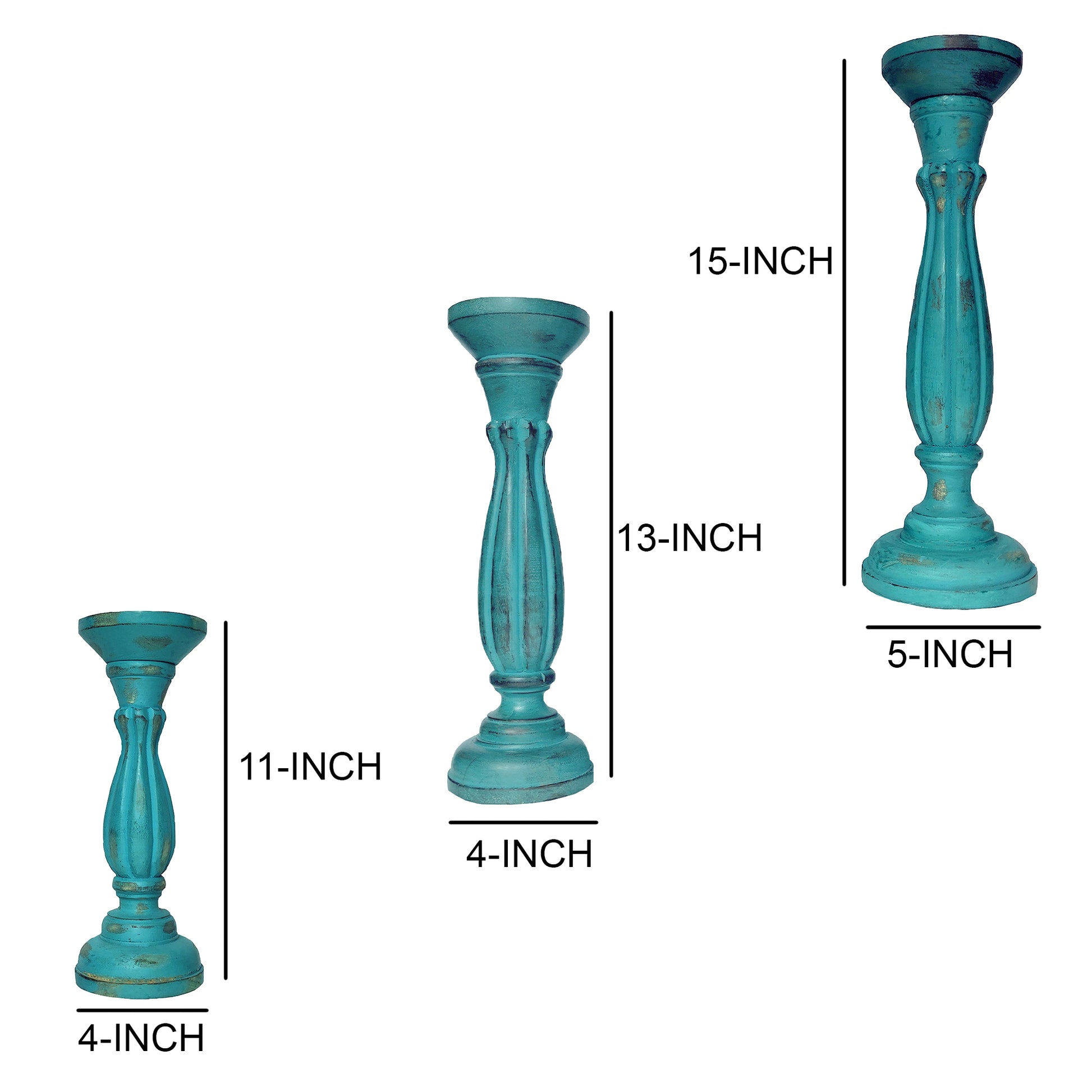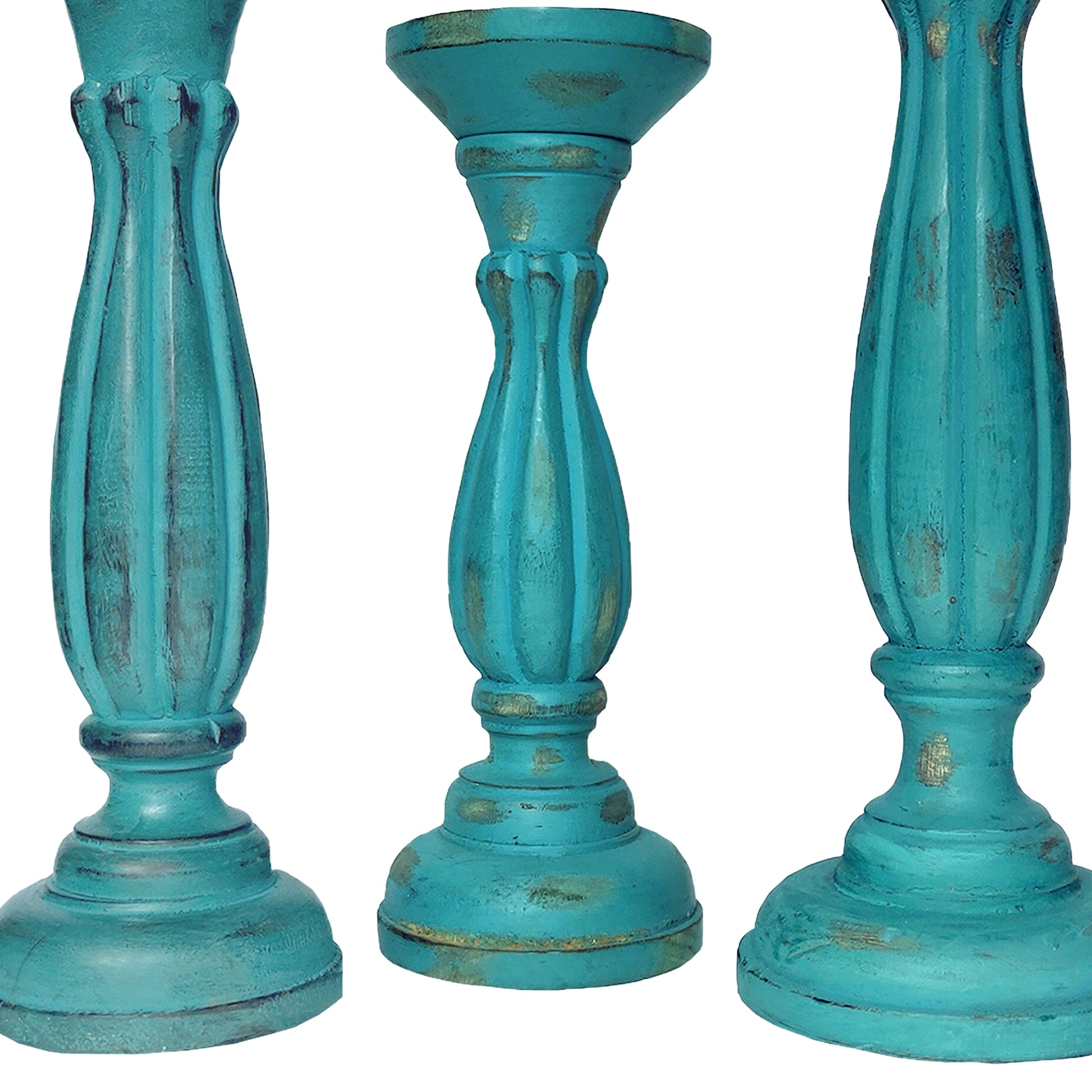 Brighten up your home interior with the inclusion of this classic design set of 3 candle holders. Handcrafted from wood and offer a distressed turquoise blue finish, this pillar shape candle holder features classic tapered design paired with deep vertical grooving on its body and iron plated flared top that provides great support to your candles. This candle holder is designed to complement the classic setting of your home or office. Due to the handcrafted nature of the product, there may be variation in color, finish, wood grain and knots.