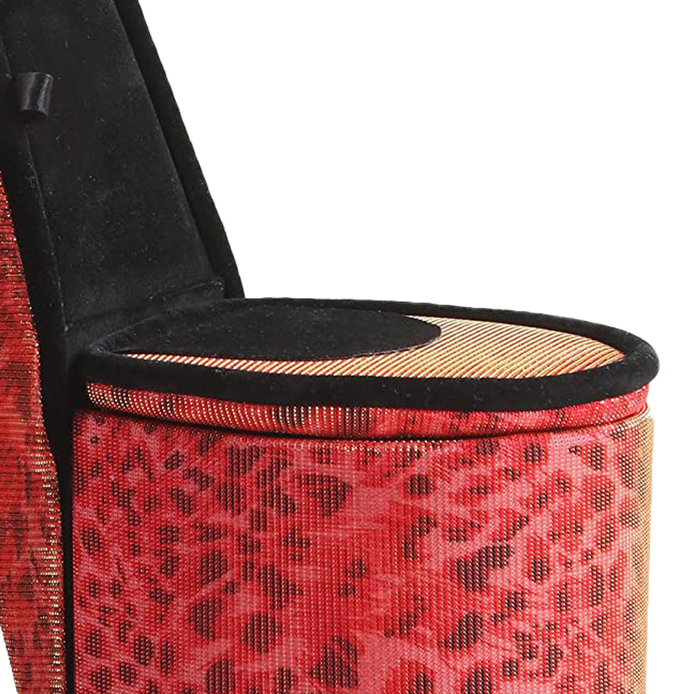Add distinctive appeal to your dressing area with this captivating High Heel Shoe Jewelry Box, featuring leopard print. Upholstered in red velvet fabric with black borders, it comes with two mounted hooks for the jewelry display. The hidden seat storage offers space to keep your valuables tucked away safely.