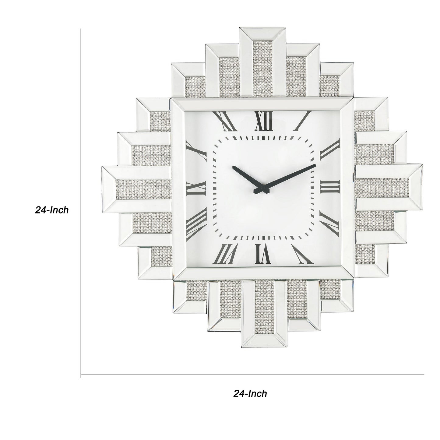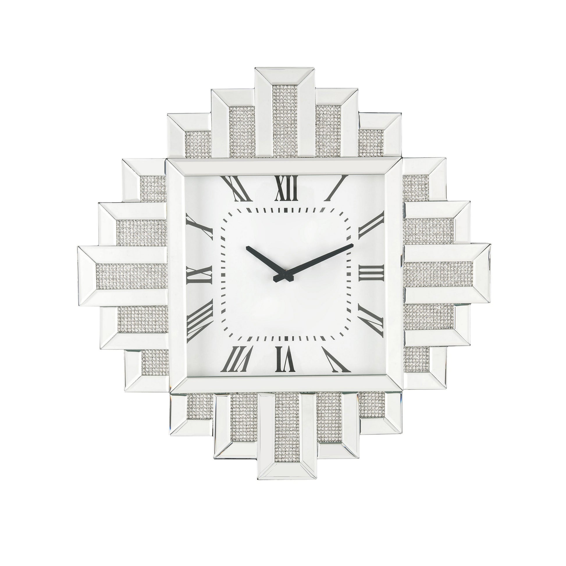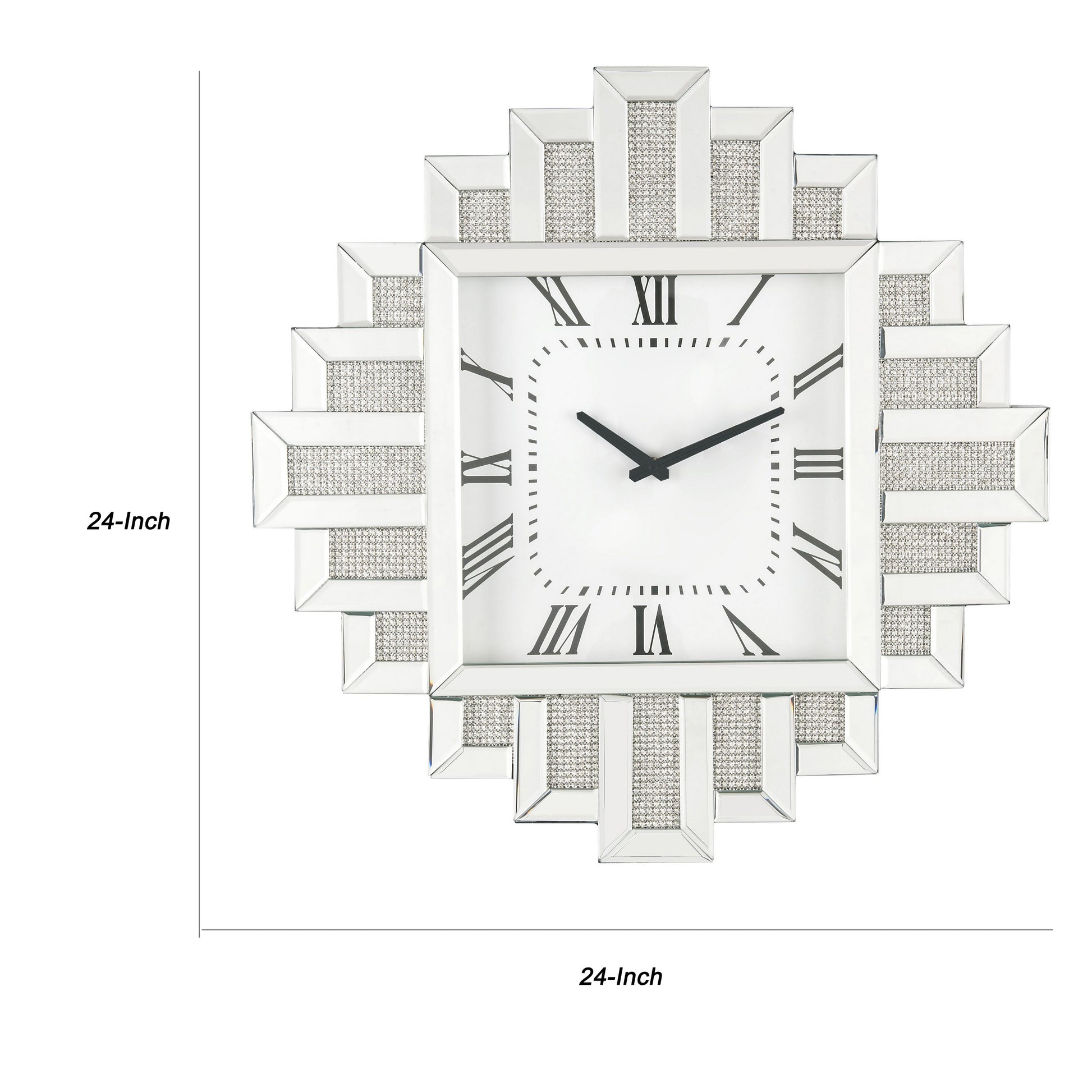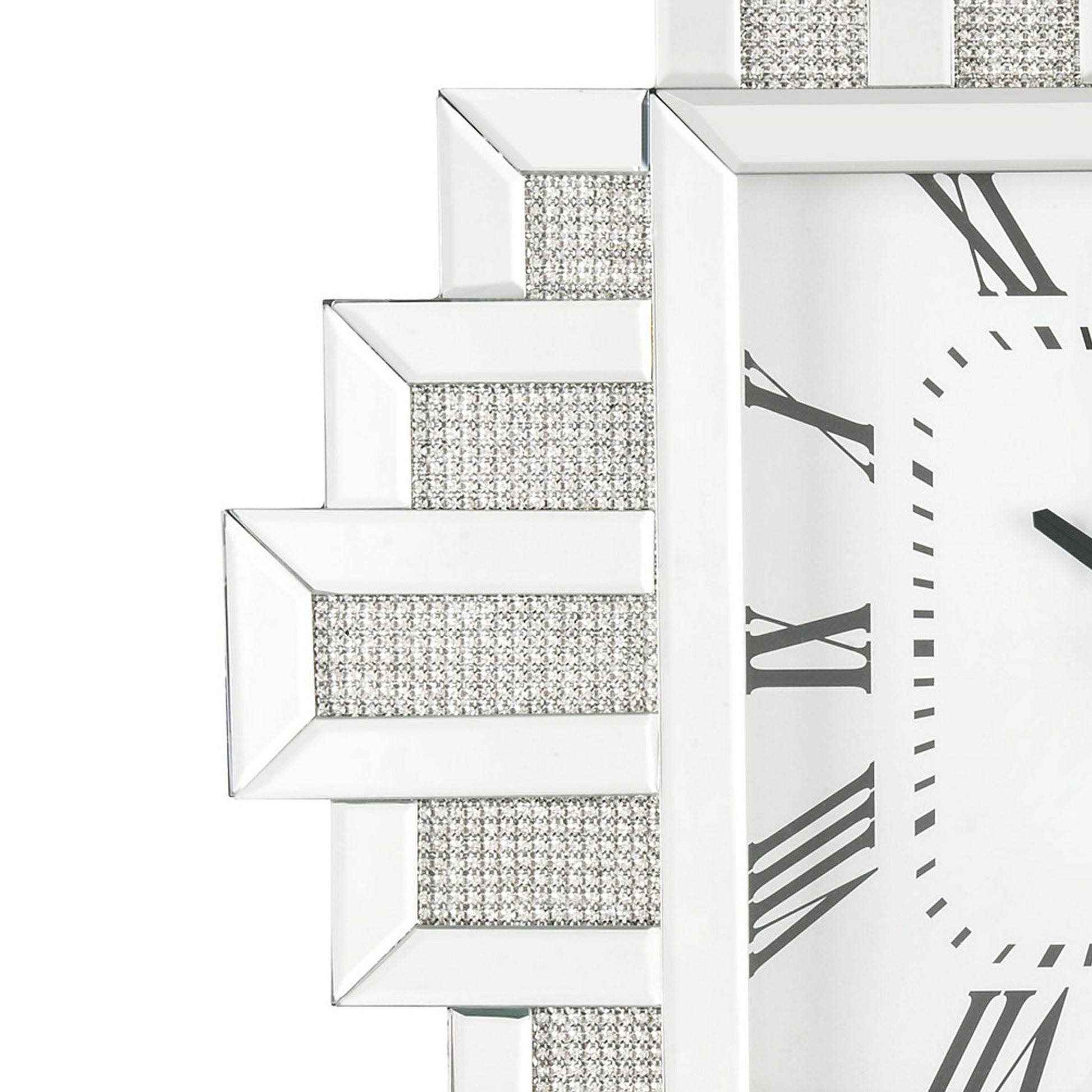 Giving a boost to your home decor, this contemporary style Wall Clock is adorned with crushed faux diamonds complemented by an irregular silhouette showcasing beveled mirror panel edges. The roman numerals add one last dash of stylish flair, while a quartz movement keeps this piece on time. This beautiful clock will add an often overlooked decorative touch to any room.