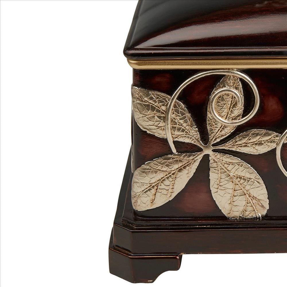 This polyresin constructed jewelry box depicts a sense of class and also is extremely useful. It has foliage pattern with encrusted crystals and a decorative finial on top which acts as a handle. The footed base lends support and stability to the entire piece.