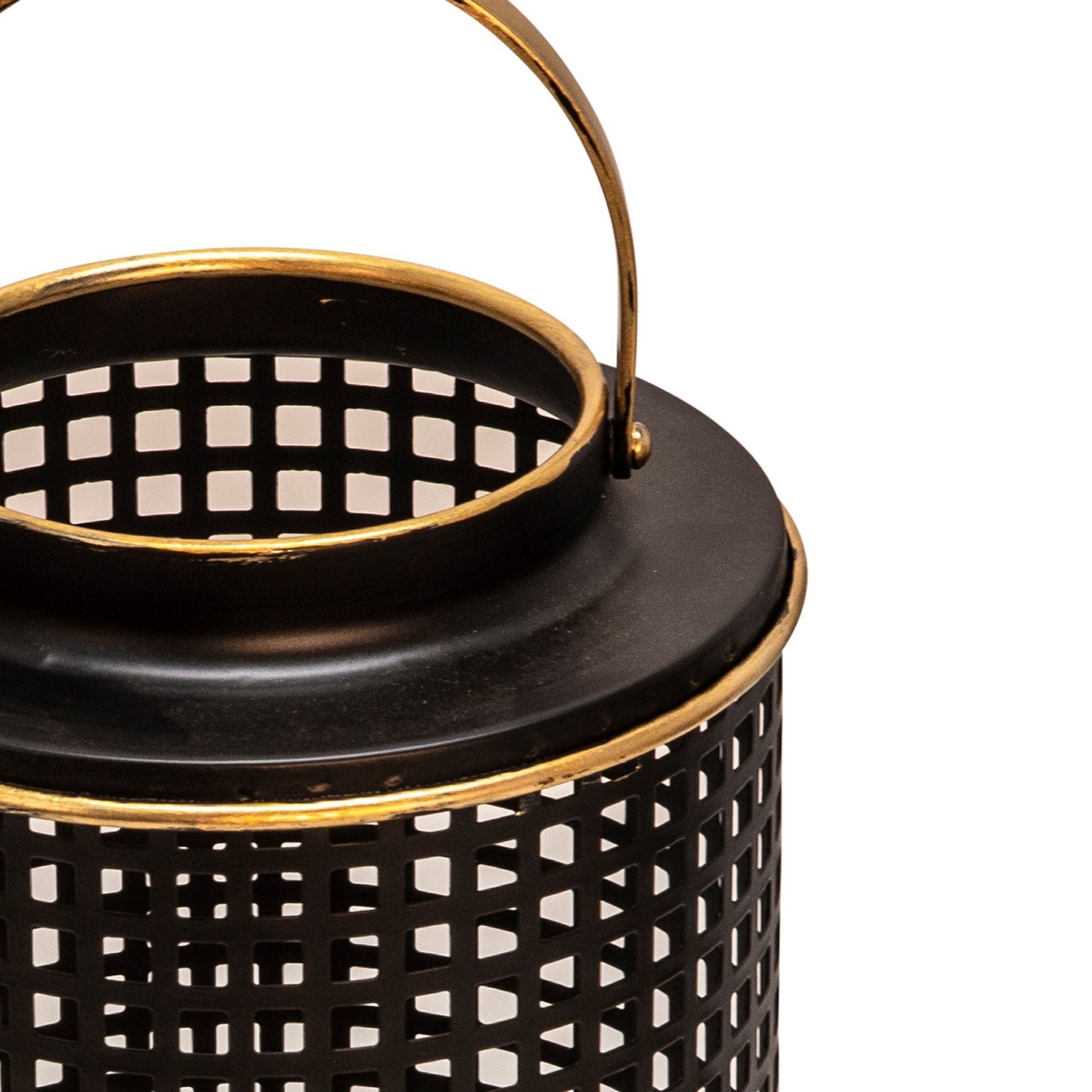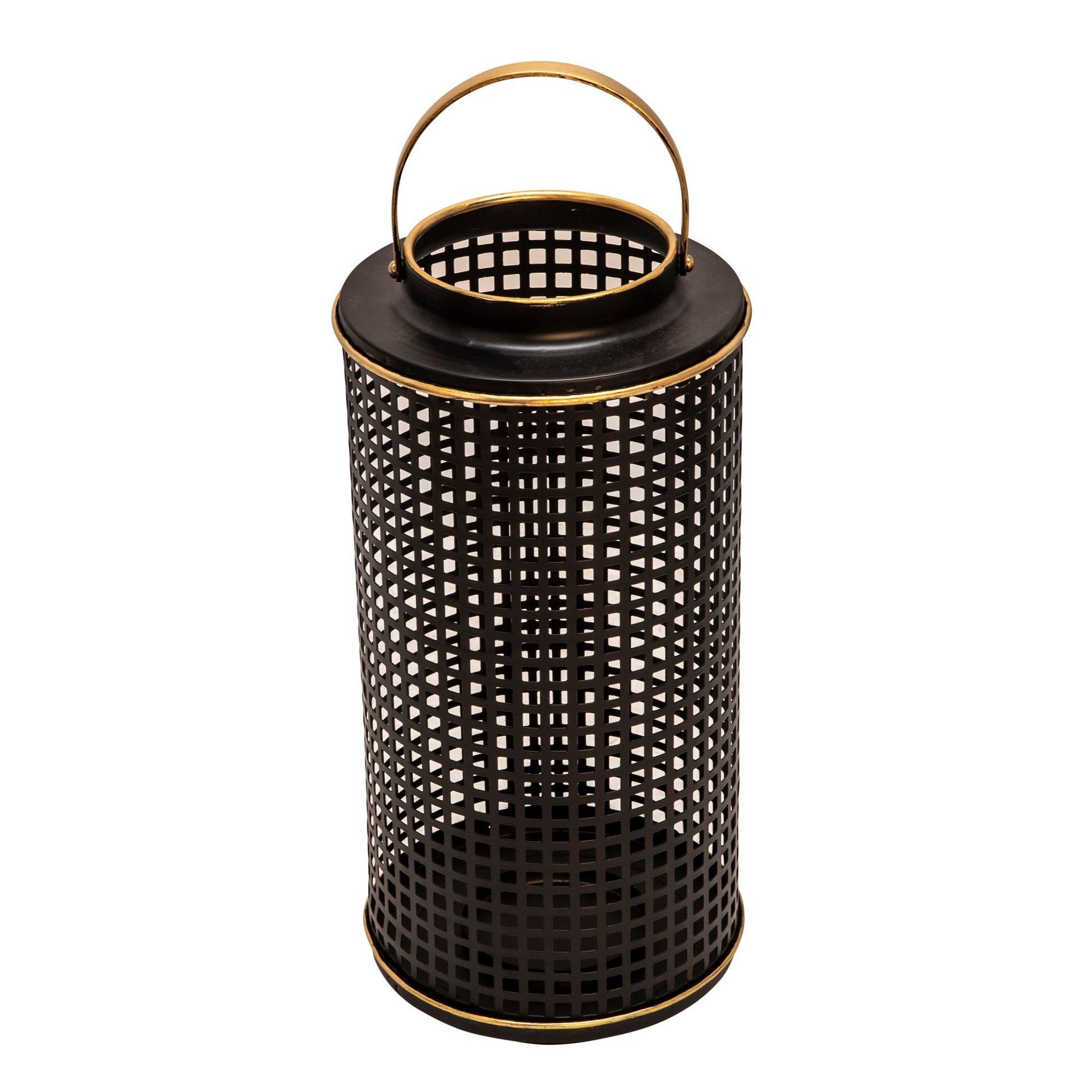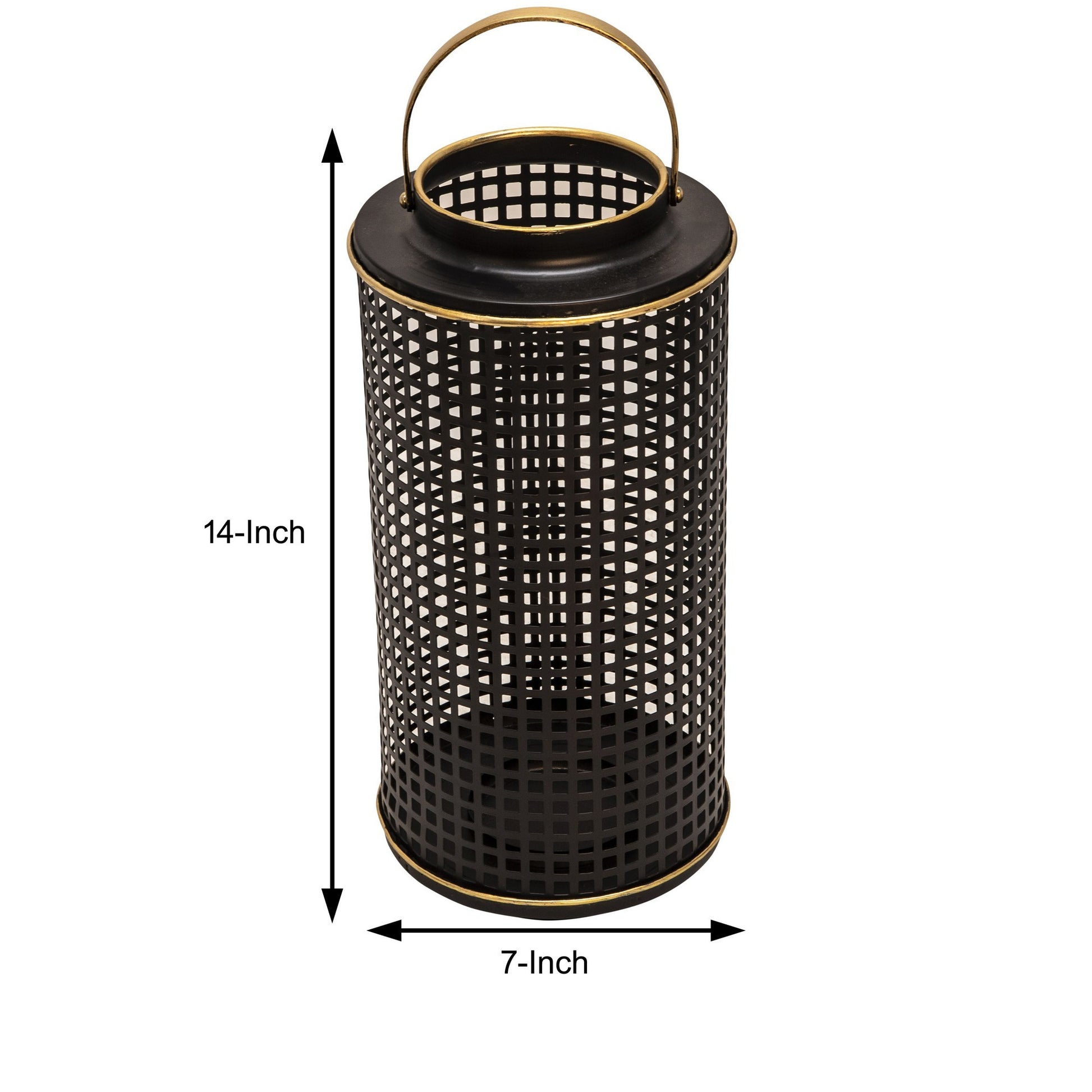 Radiate a warm, breathtaking glow throughout your home with this gorgeous 14 Inch metal candle holder made of high quality black coated metal and gold painted detailing. The minimalistic cylindrical grid frame brings unique style to any countertop or shelf, and can easily be hung on a hook in your entryway or in your backyard. Check out our Kate collection for matching items and size options.