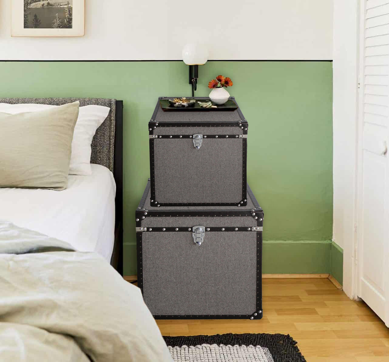 Mandalay Square Tweed Trunks, Constructed of high-quality canvas fabric,durable wood, faux leather. Great Decrotive Accessories, Organizer, etc. It truly combins decoration and function in one at great classical leavel! Fitting in every setting.