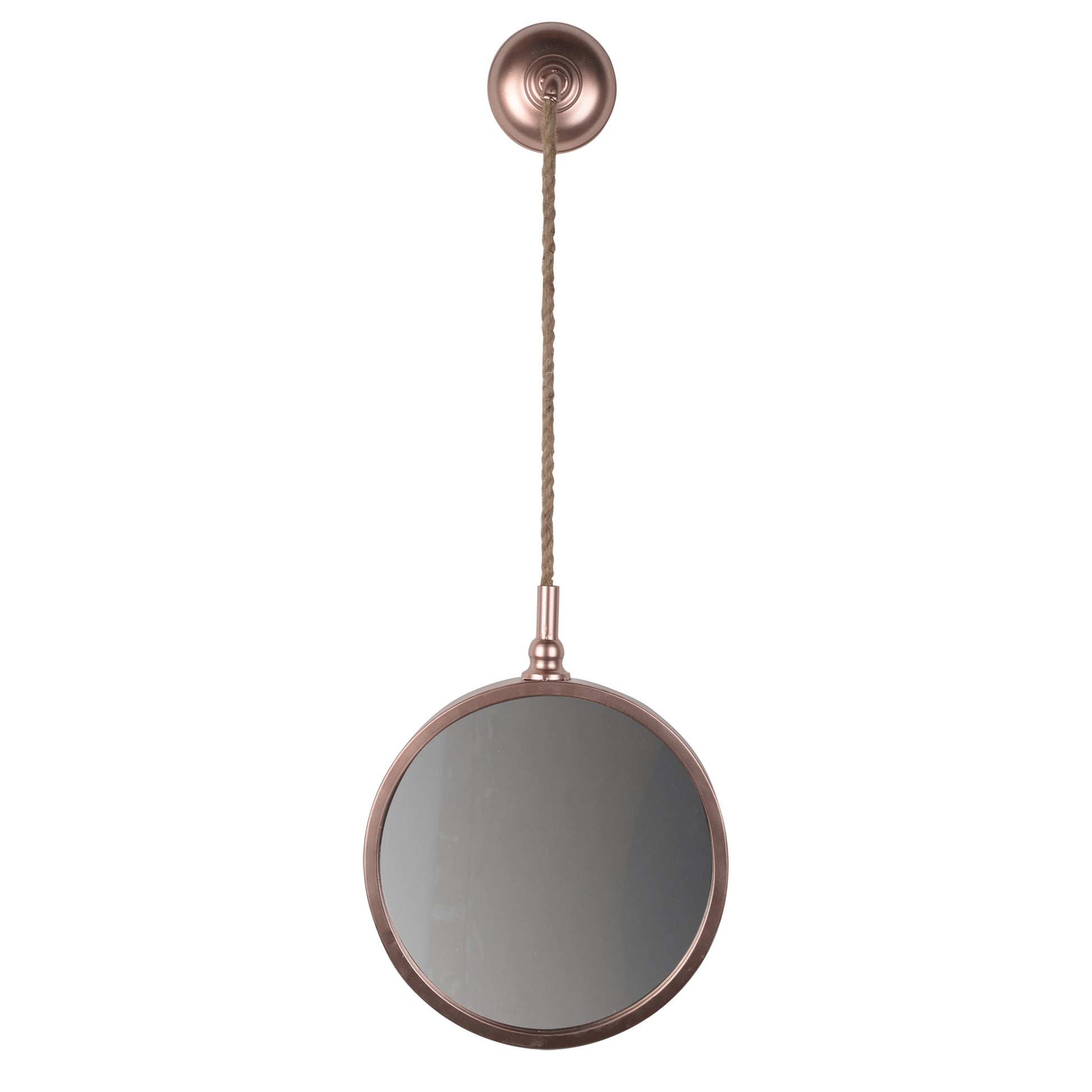 - It features round metal framed mirror with attached rope hanging