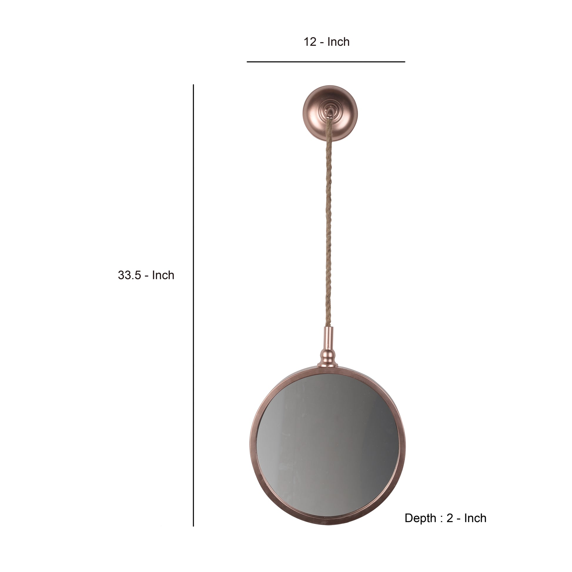 Exemplifies artistic design, mount this classic round mirror on the entrance wall of your living room or in the staircase area to create an aura of transitional appeal. Beautifully made using metal, wood and mirror in a copper color, this small-sized mirror features a unique design. With a thick metal framed circular border, this has rope attachment for easy hanging. Mount this alone to create a personalized space.
