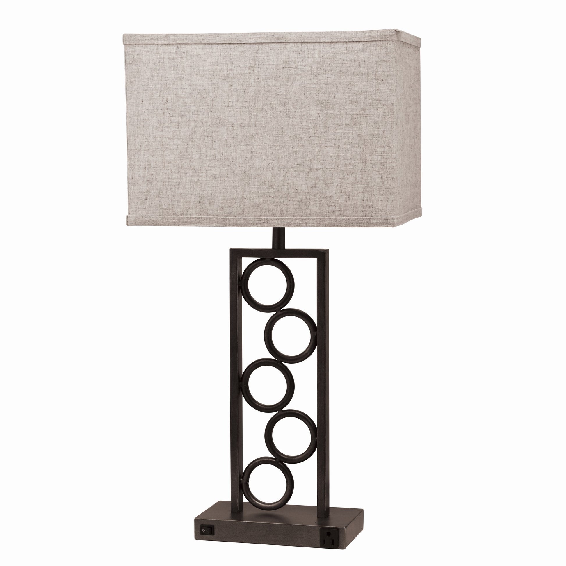Add depth and dimension to any of your tabletop with this set of 2 Table Lamps. Showcasing a rectangular fabric shade, these lamps feature a geometric design brown finished metal base that has a stacked circles and is operated by a rocker switch. The included electrical outlet in the base provides you more convenience.