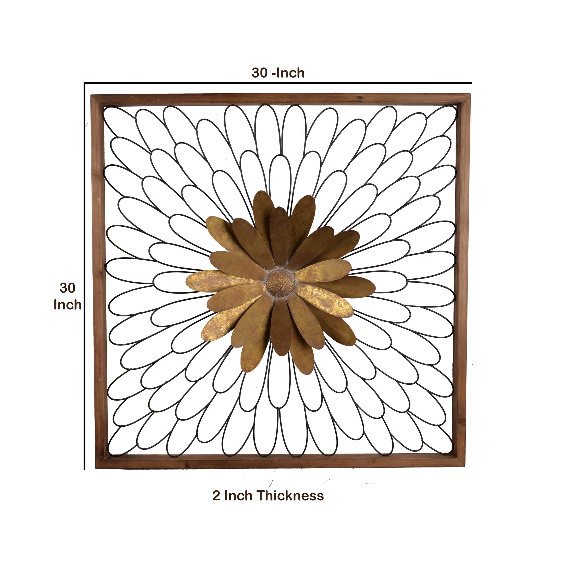 Metal Wall Decor With Wooden Frame And Leafy Flower Bronze
