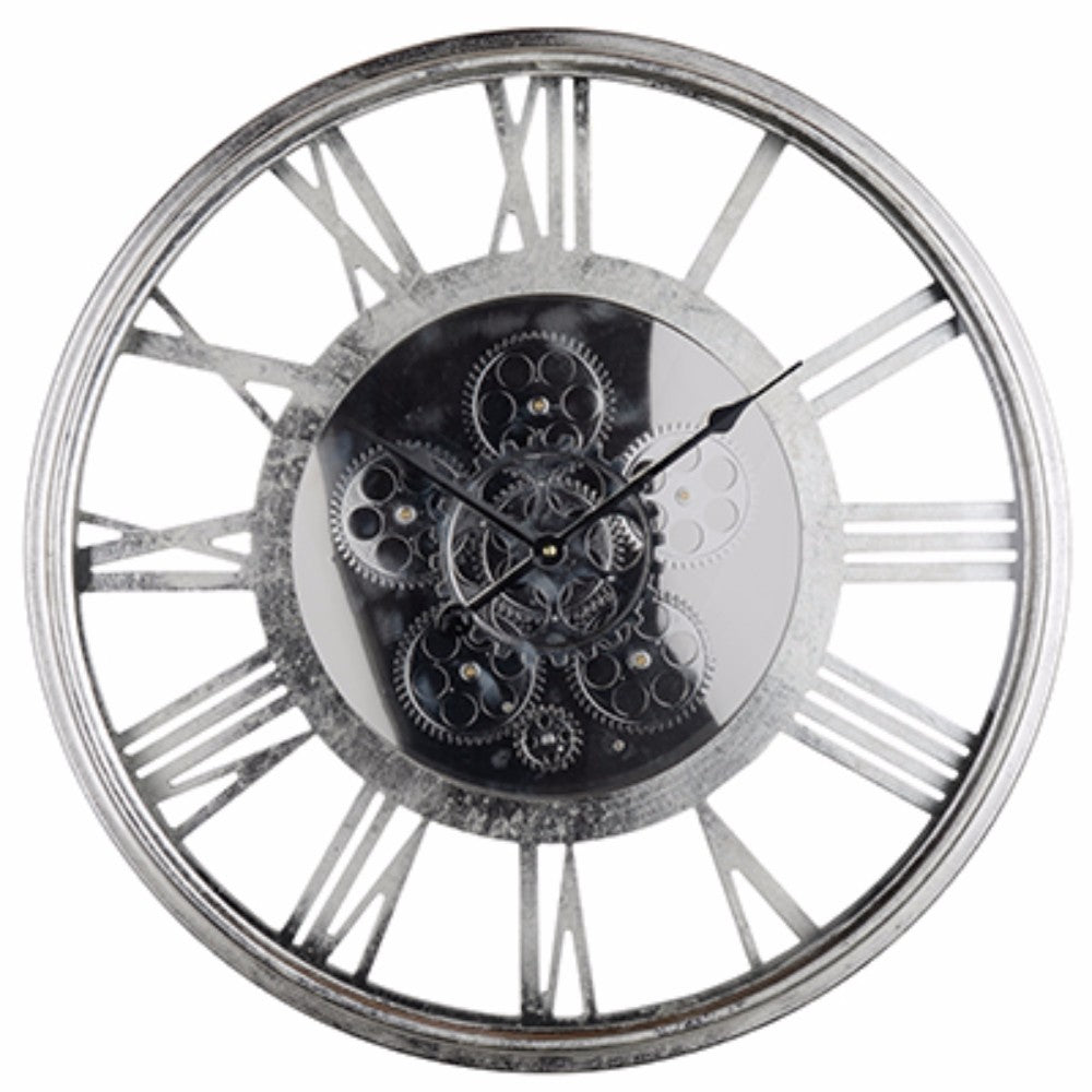 Minimalism meets sleek style in this wall clock. Lending a subtle shine with its metallic body and reflective dial, it creates a beautiful play with Roman numerical, exposed mechanical gear and simple hands. Make it a part of contemporary decor that matches its style. The piece unassumingly sits on any light colored wall.