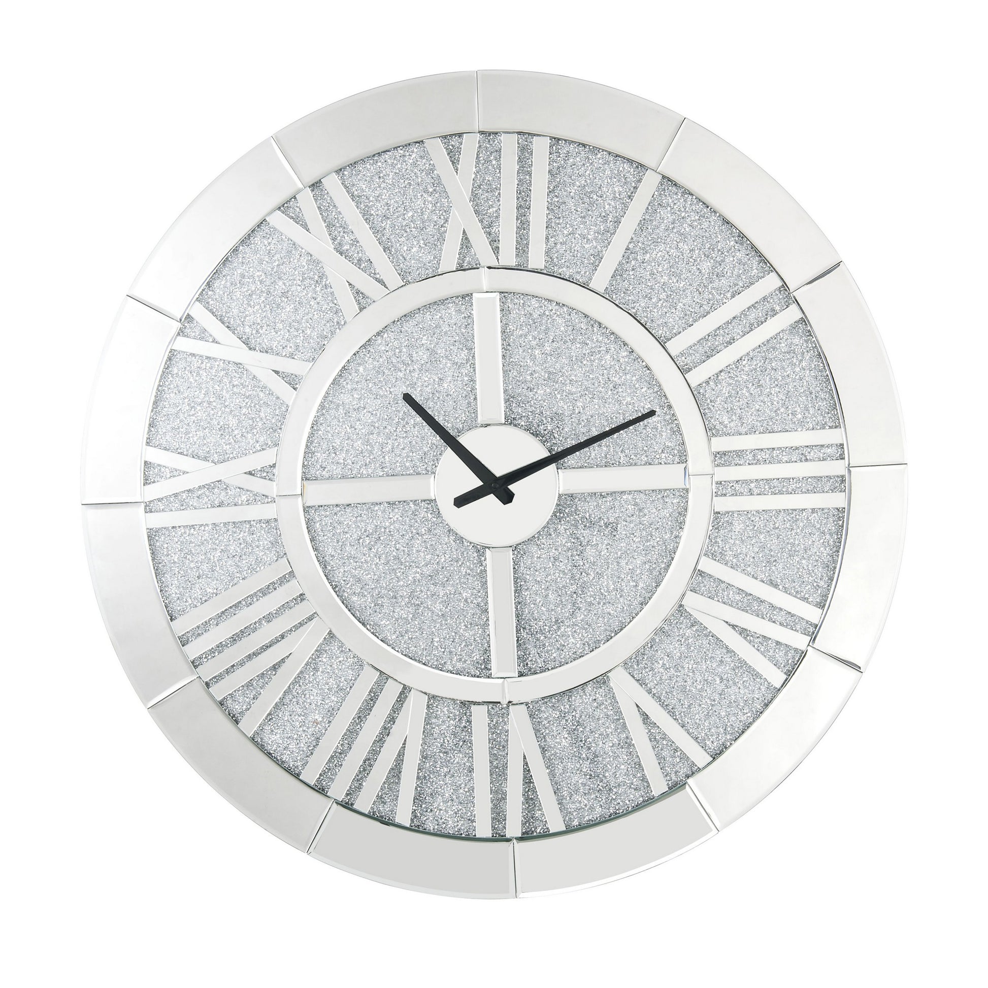 Giving a boost to your home decor, this contemporary style Wall Clock is adorned with crushed faux diamonds complemented by a round silhouette showcasing beveled mirror panel edges. The roman numerals add one last dash of stylish flair, while a quartz movement keeps this piece on time. This beautiful clock will add an often overlooked decorative touch to any room.