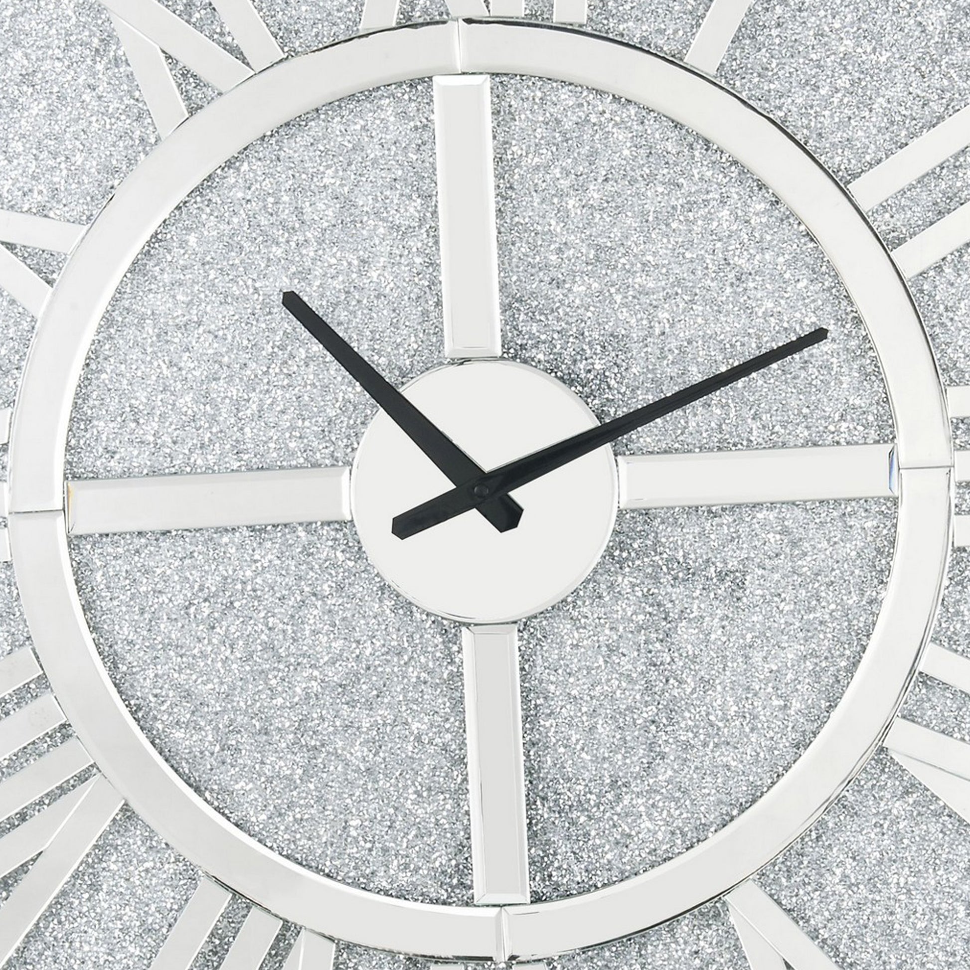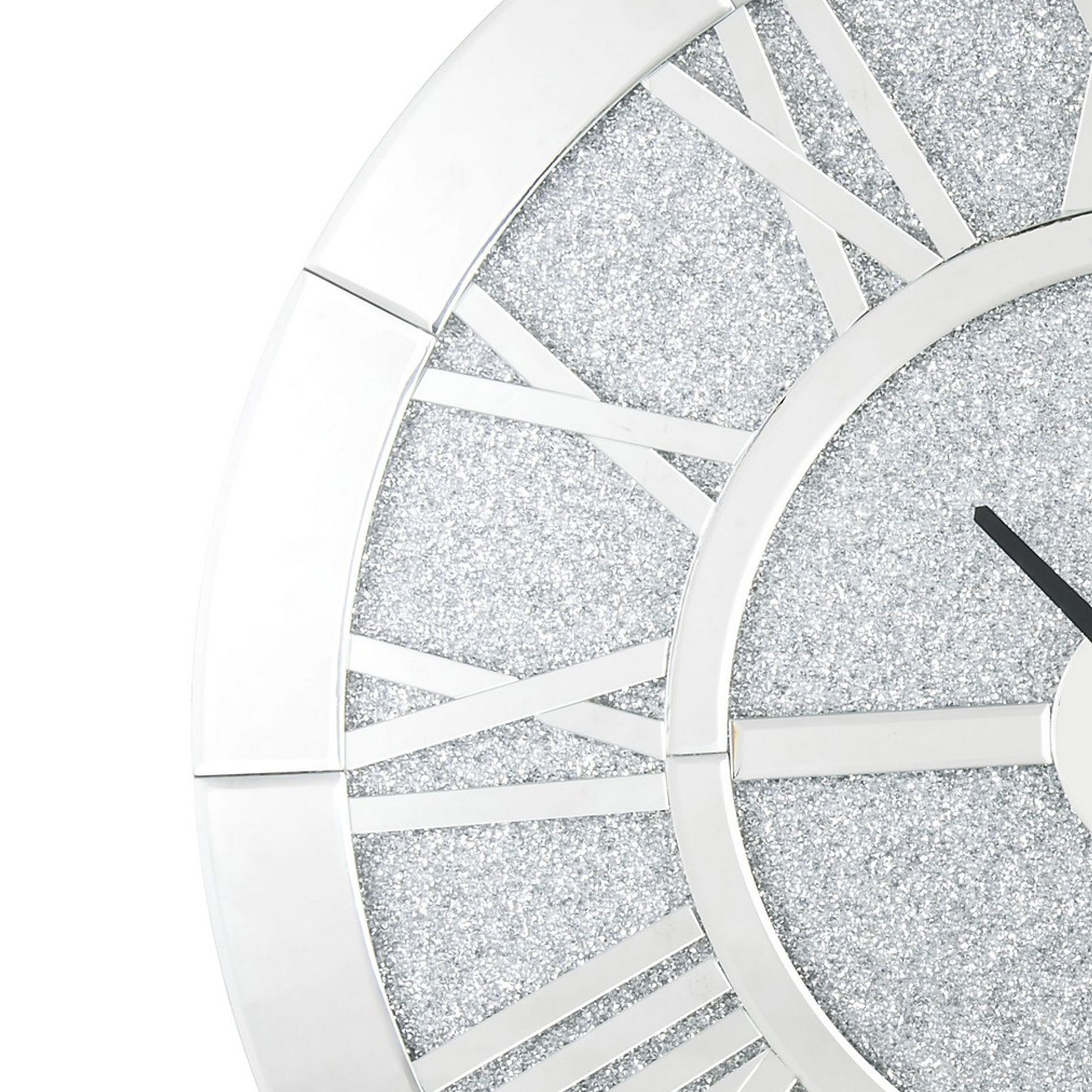 Mirror Panel Frame Wall Clock With Crushed Faux Diamond Inlay Silver