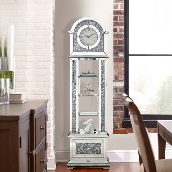 Classic and timeless, this grandfather clock with roman numerals and two minimalist hands will be a compelling centerpiece in any living space. It has a beveled mirror framing that brings in style and elegance. The 3 tier shelves and pull out drawer offer handy storage space whereas the faux diamond accents add lightness to the design. This grandfather clock fits seamlessly into any room.