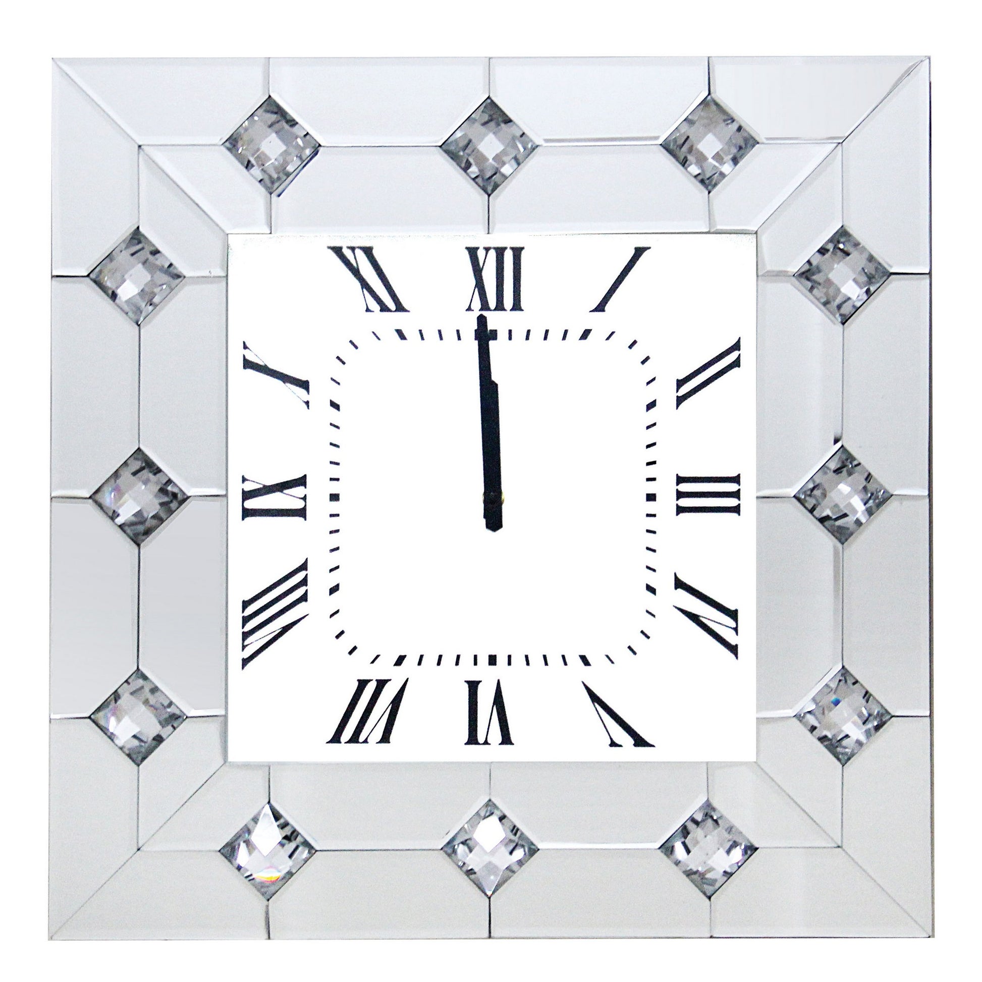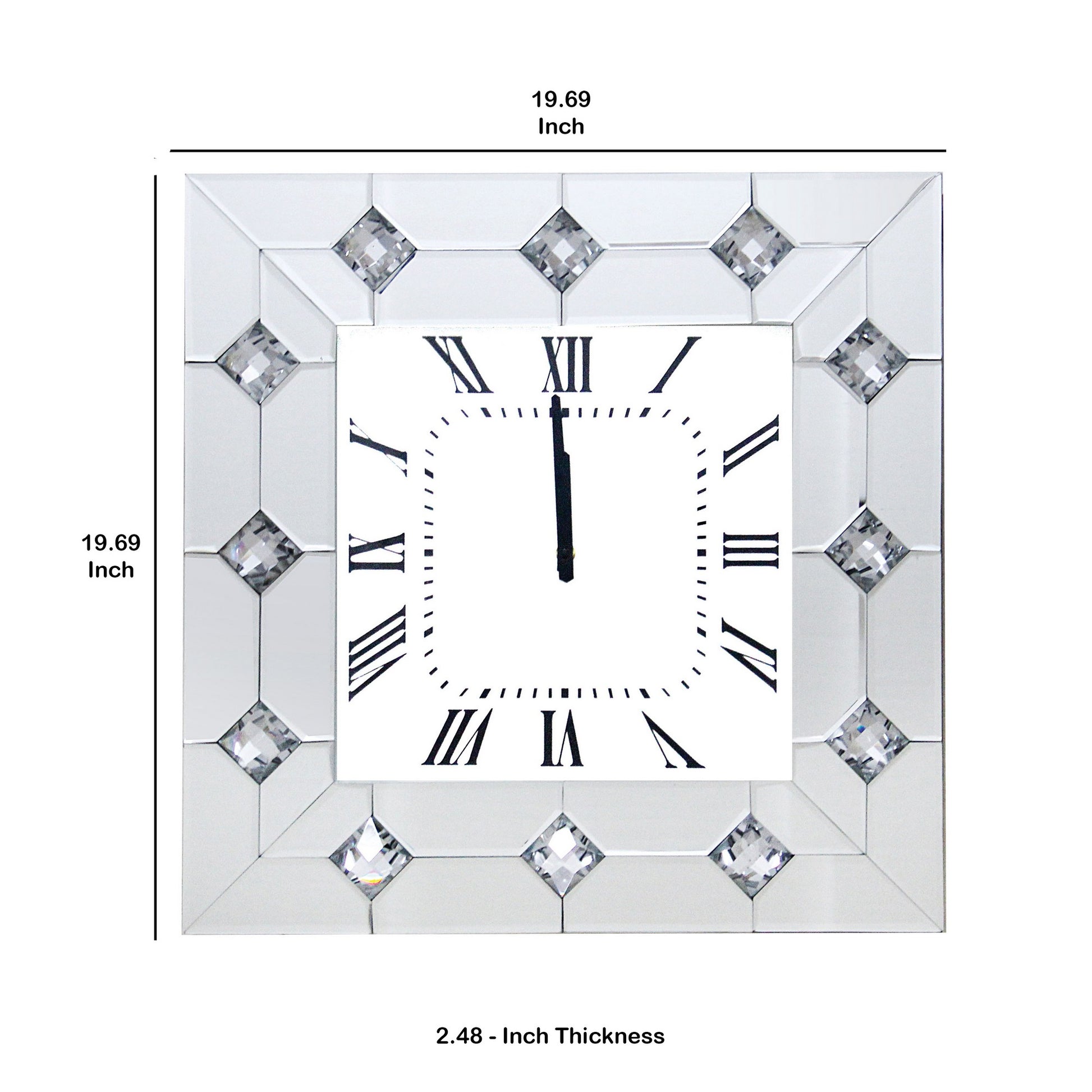 Mirrored Square Shape Wooden Analog Wall Clock With Crystal Accents White