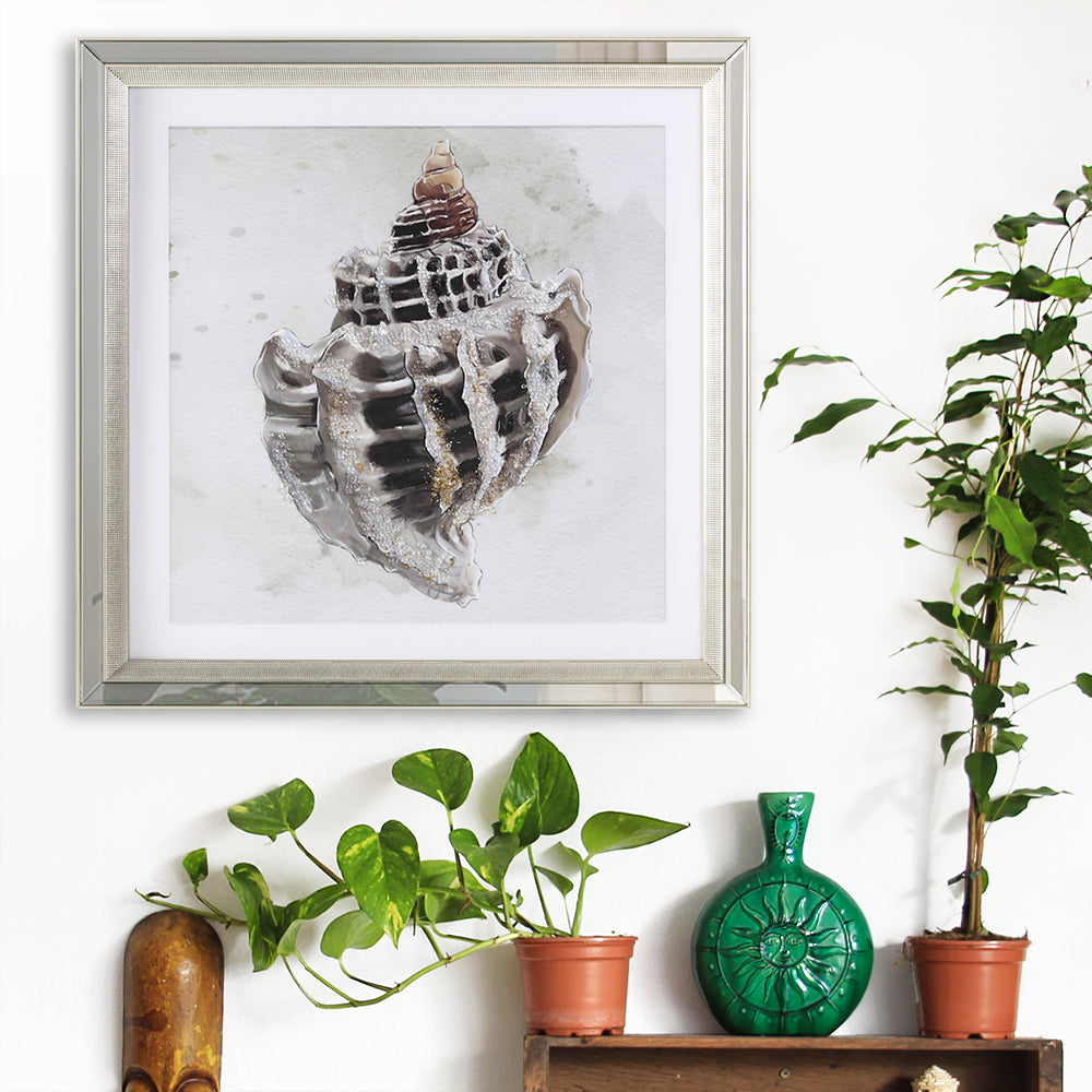 A bit of glamour and elegance comes with this this nautical sea shell. The clear droplets throughout the image show off a wonderful display of a glimmer effect on the painting. The acrylic frame of this painting is done with a textured edge, finished with thin mirror around it. Ready to be displayed right out of the box with attached D-rings in no time.