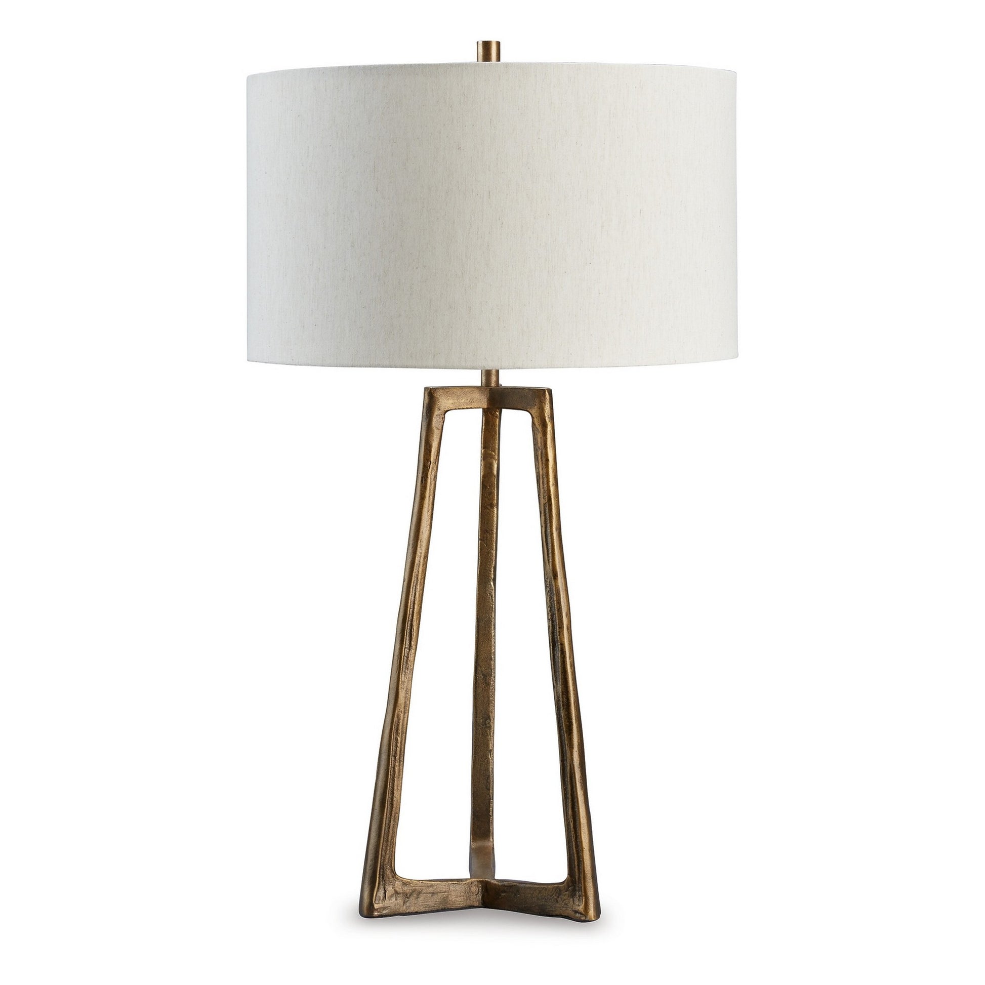 This artisanally designed and artfully crafted table lamp is a perfect accent for any modern home. Made from antique brass cast aluminum, it is comprised of an angled metal frame that stands upright and holds a hardback fabric drum shade that beautifully filters light into any living room or workspace. Check out our Nila collection for more color options.