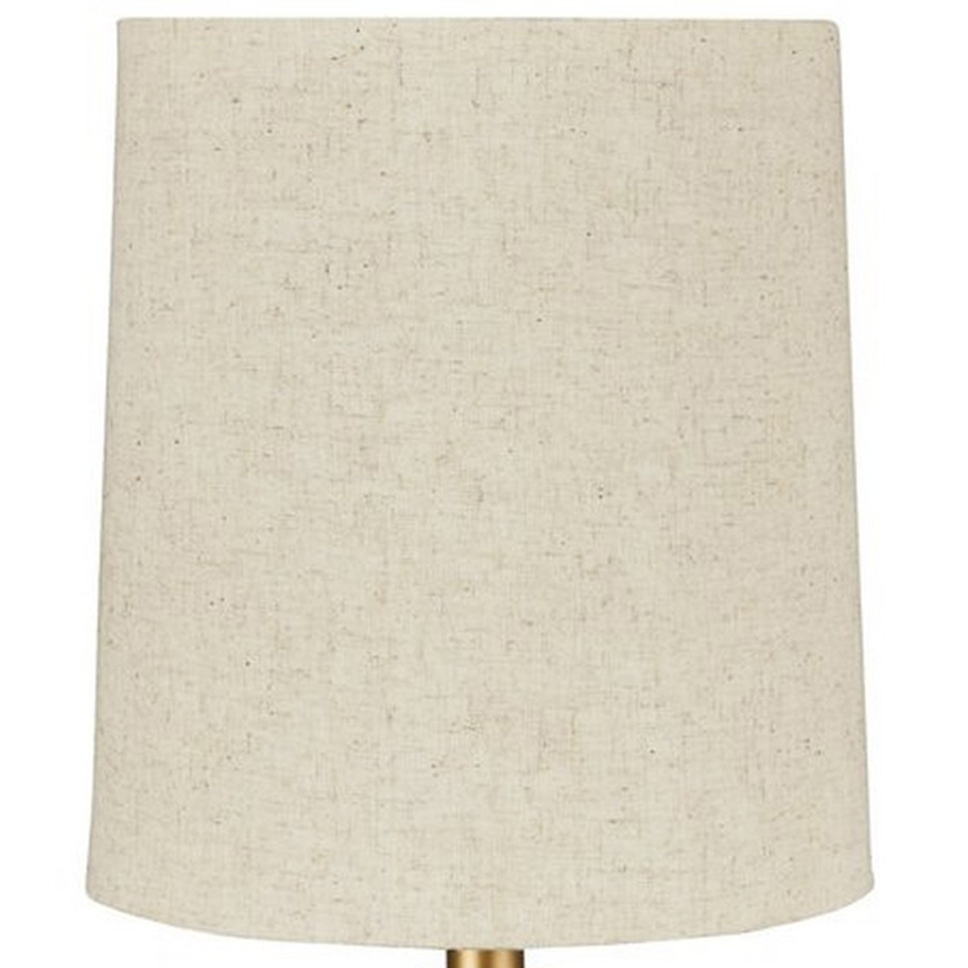 Improve the aesthetics of your living space with the inclusion of this sophisticated table lamp. It features a pot bellied metal body with textured golden embellishment, incorporating an on off switch and a tapered fabric shade that uses an A type bulb of 60 watt or 13 watt CFL.