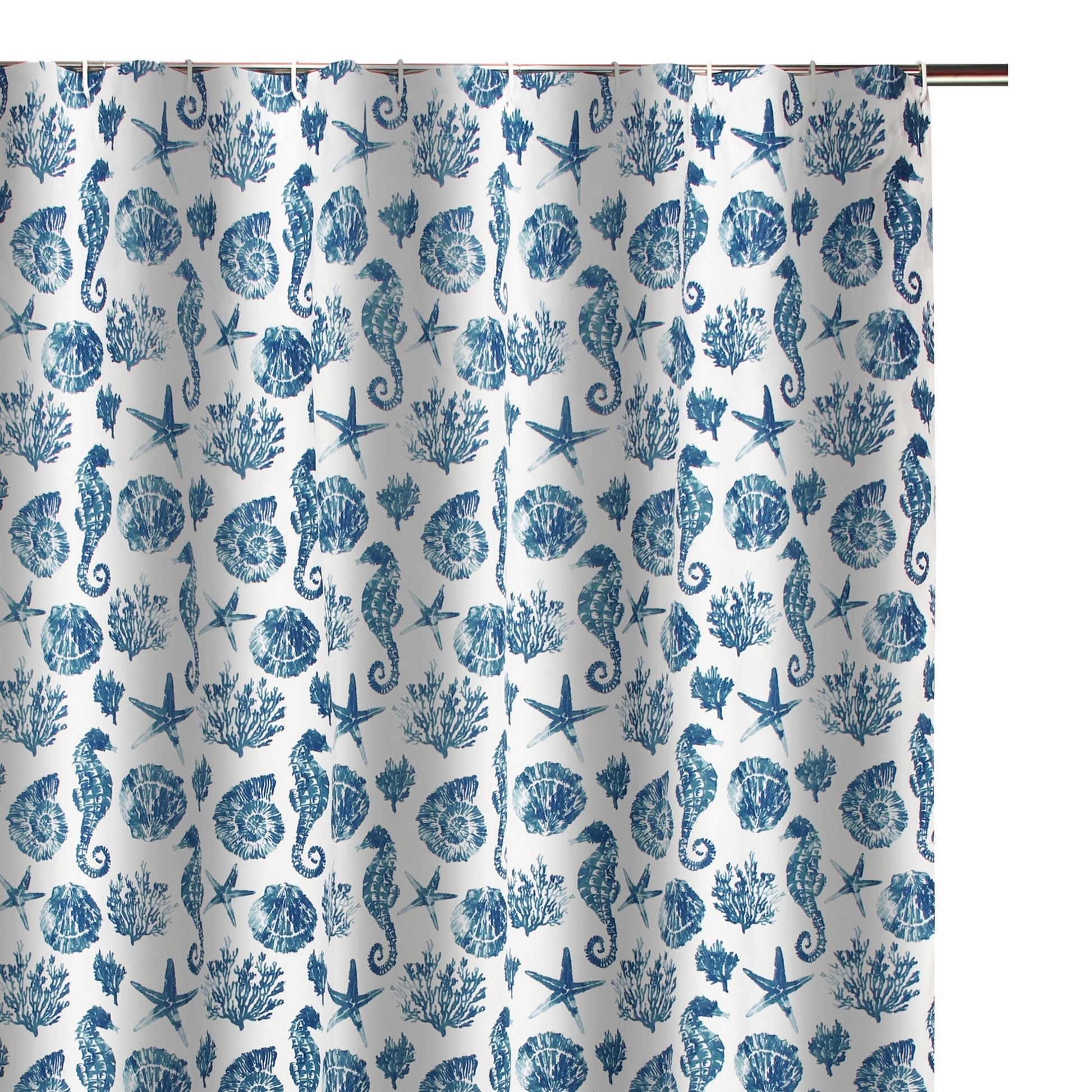 Riga 72 Inch Shower Curtain Blue Seashells Print Button Holes Microfiber