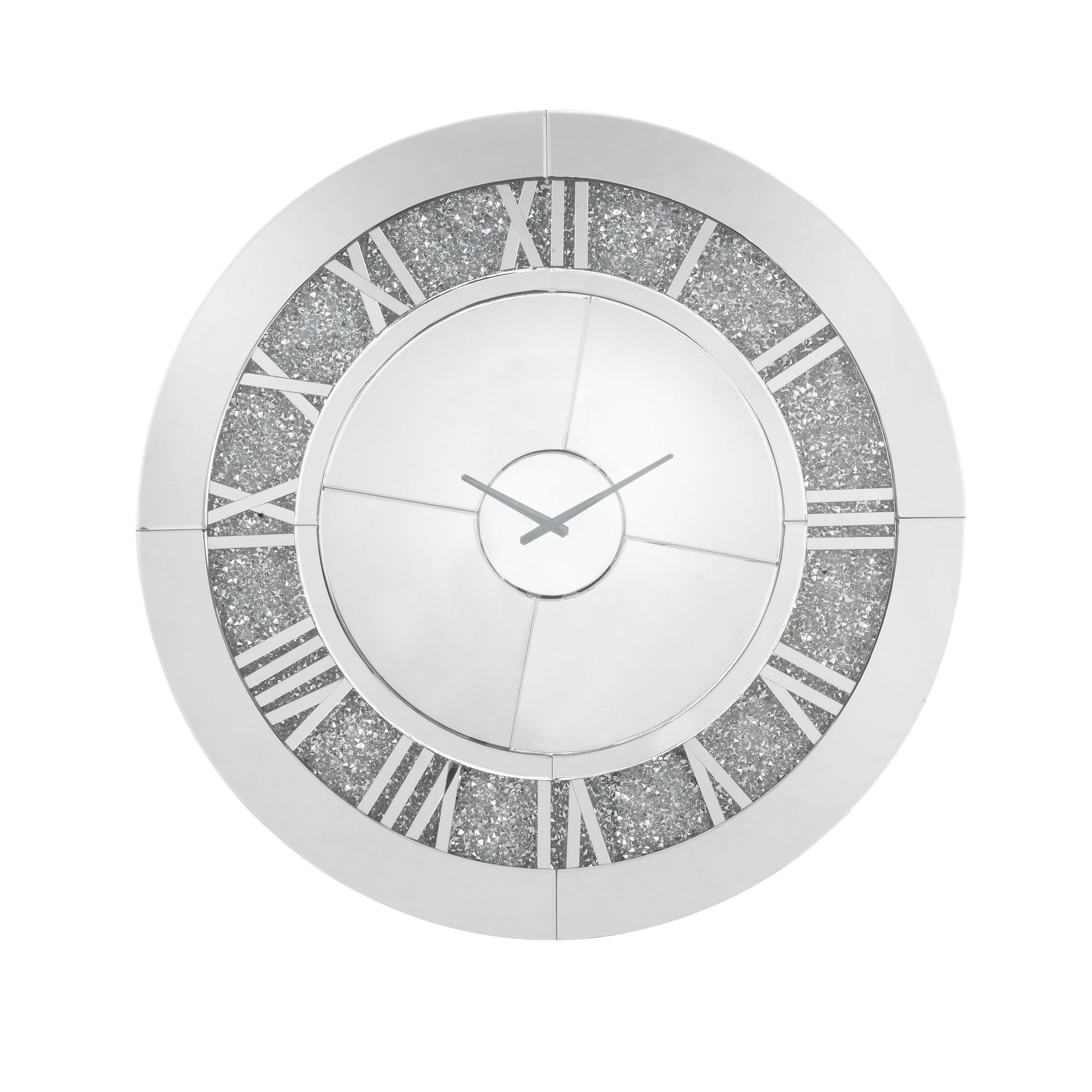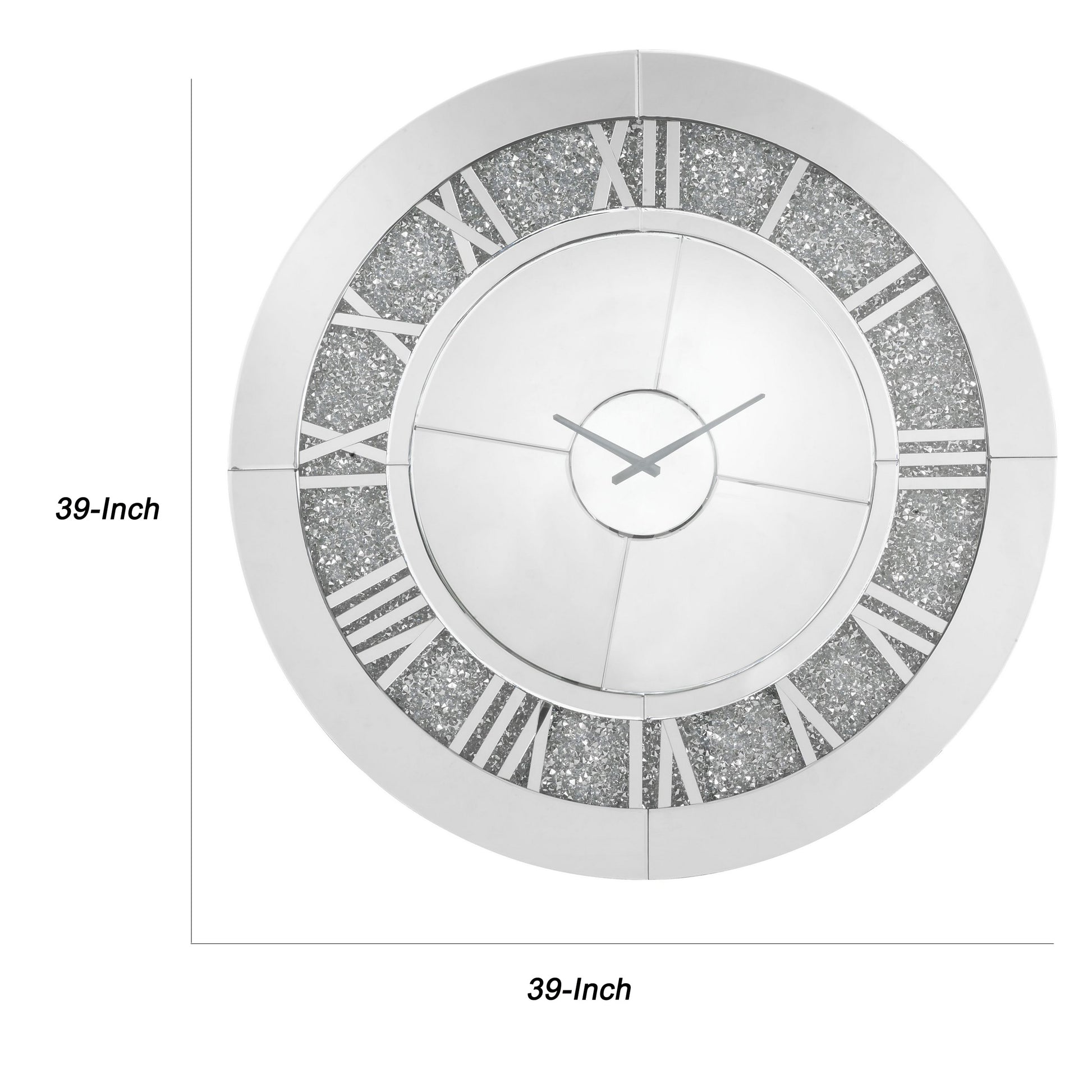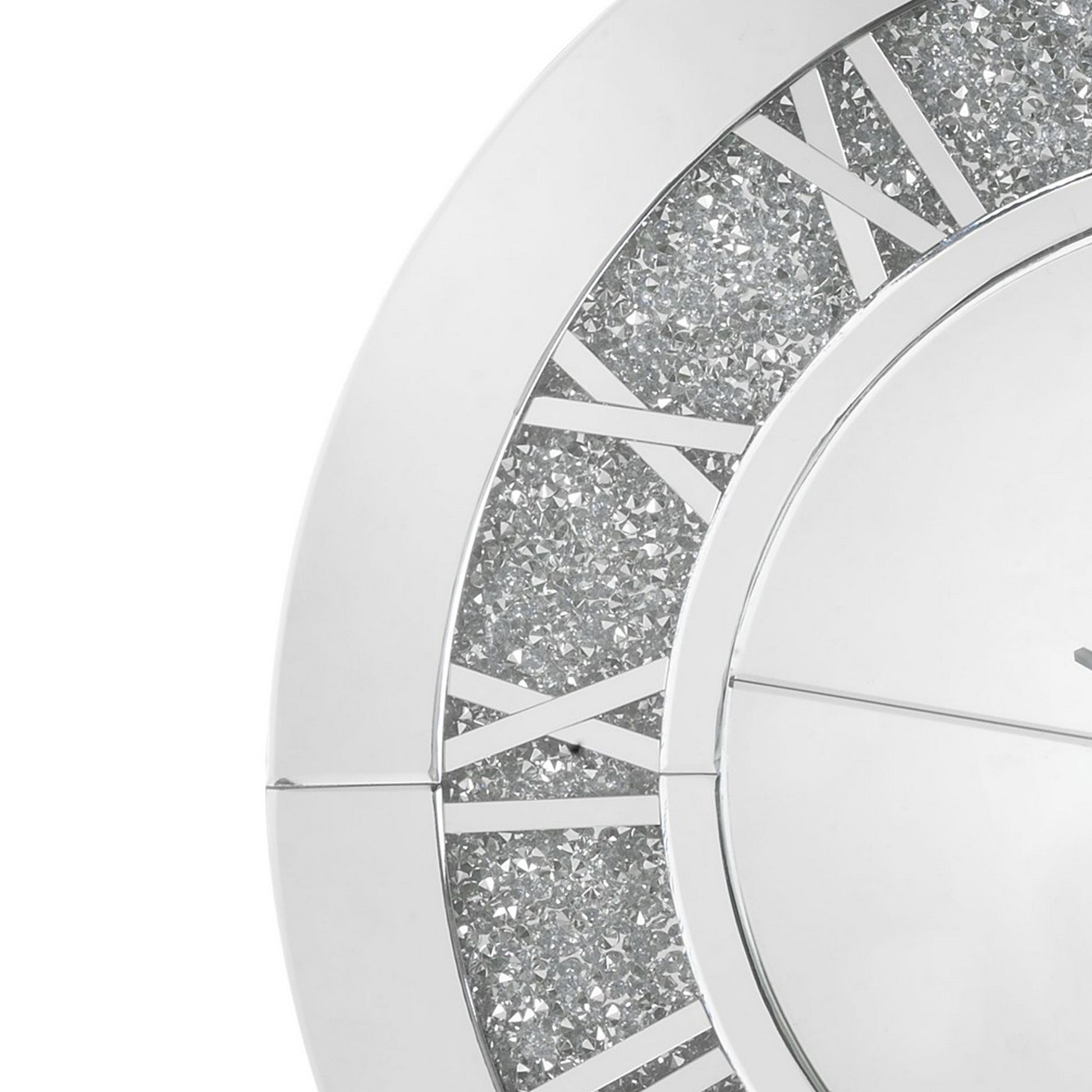 Giving a boost to your home decor, this contemporary style Wall Clock is adorned with faux diamonds complemented by a round silhouette showcasing beveled mirror panel edges. The roman numerals add one last dash of stylish flair, while a quartz movement keeps this piece on time. This beautiful clock will add an often overlooked decorative touch to any room.