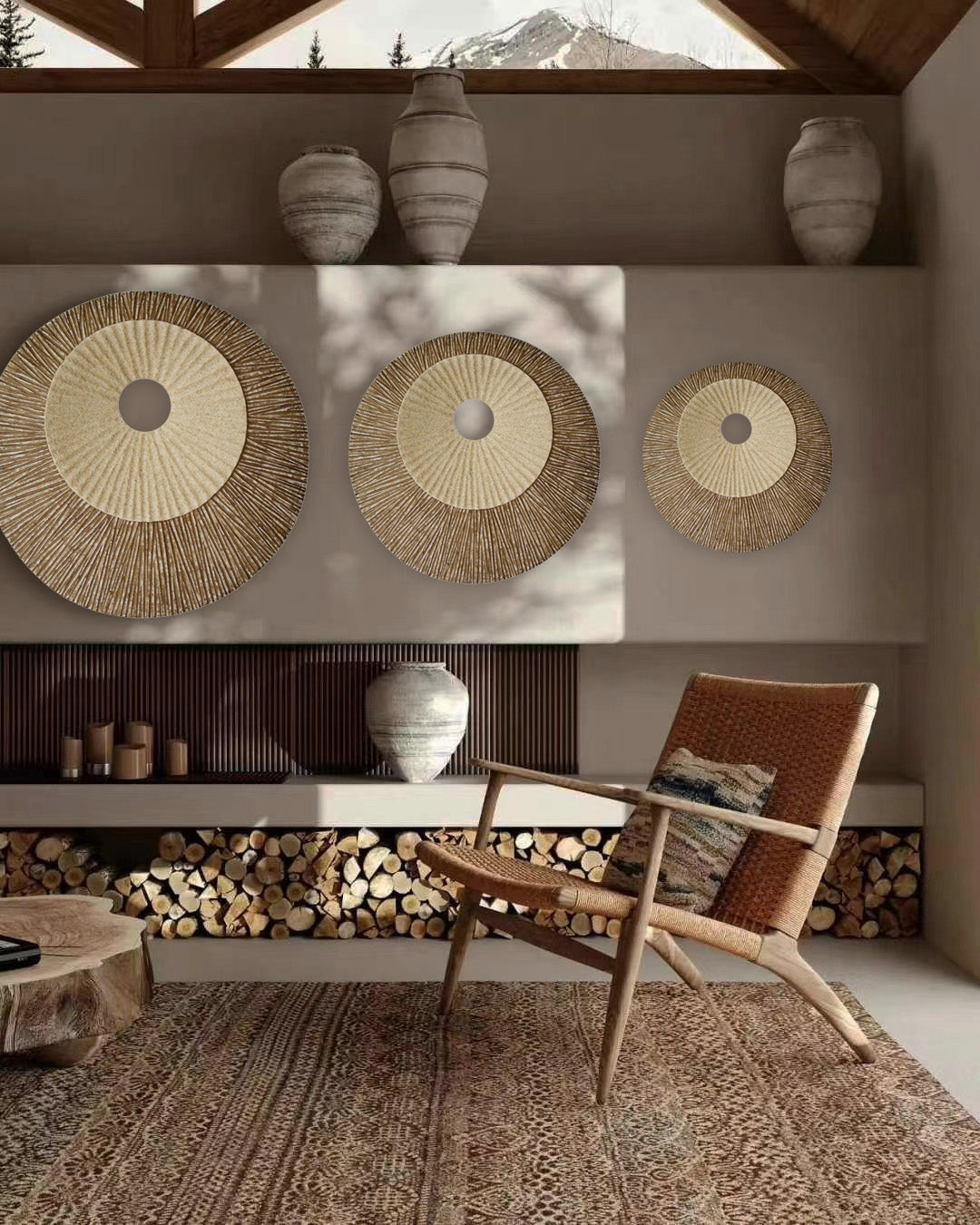 The nature sand color finished Sandston wall Art offers something truly unique for your interior space. The unpredictable process of decay is on display here, as the wall art presents a cross-section of what a rotting tree might look like. Round Double Layer Ribbed Wall Plaque.
