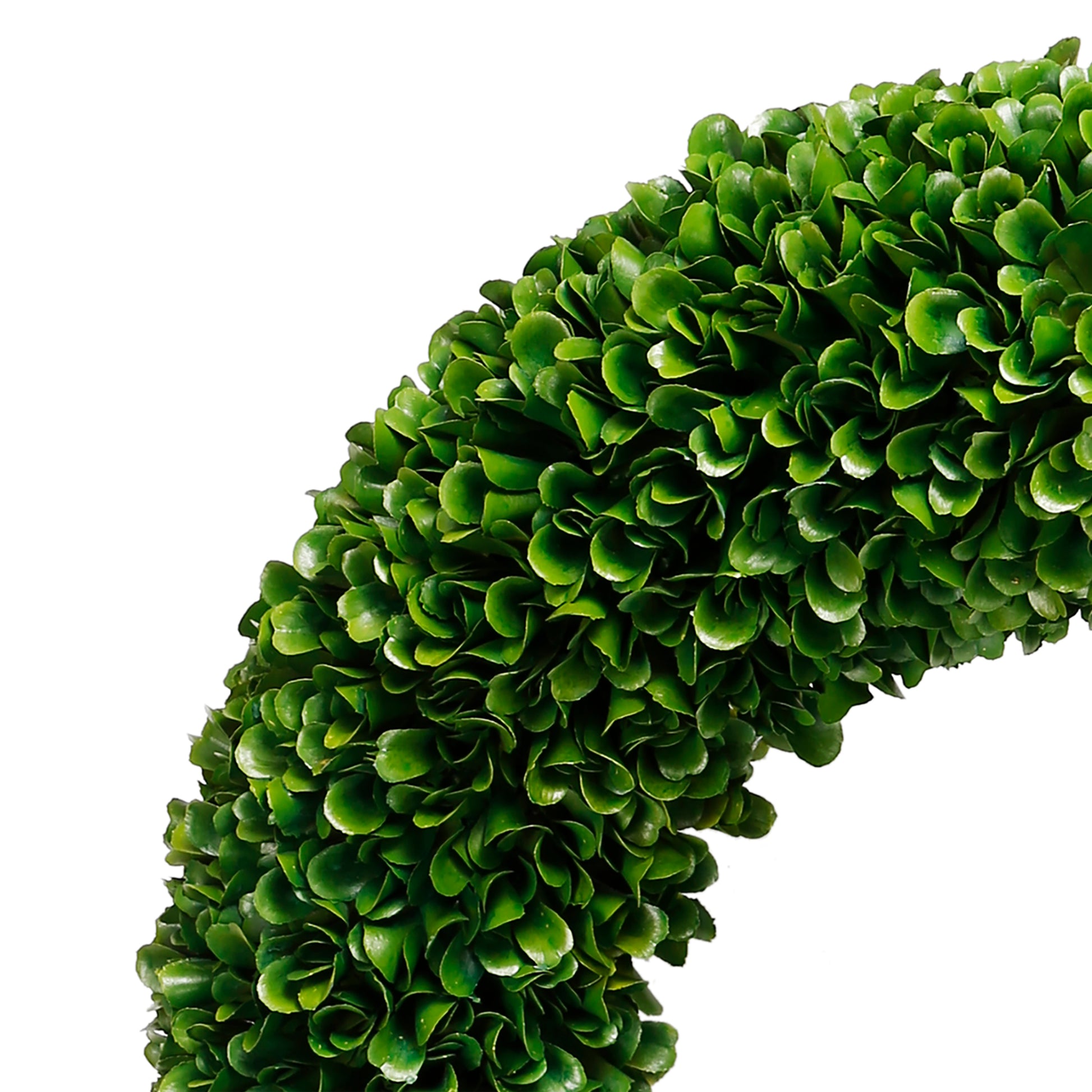 Add some greenery at your door with the inclusion of this round faux boxwood wreath, making a perfect fit for your Christmas decoration. It is crafted using foam while lifelike small leaves are created using green color plastic. Light in weight, it will make a perfect decor piece to charm your interiors with a unique and eye-catching element. With wire hardware provided at the back, you can easily install wherever required.